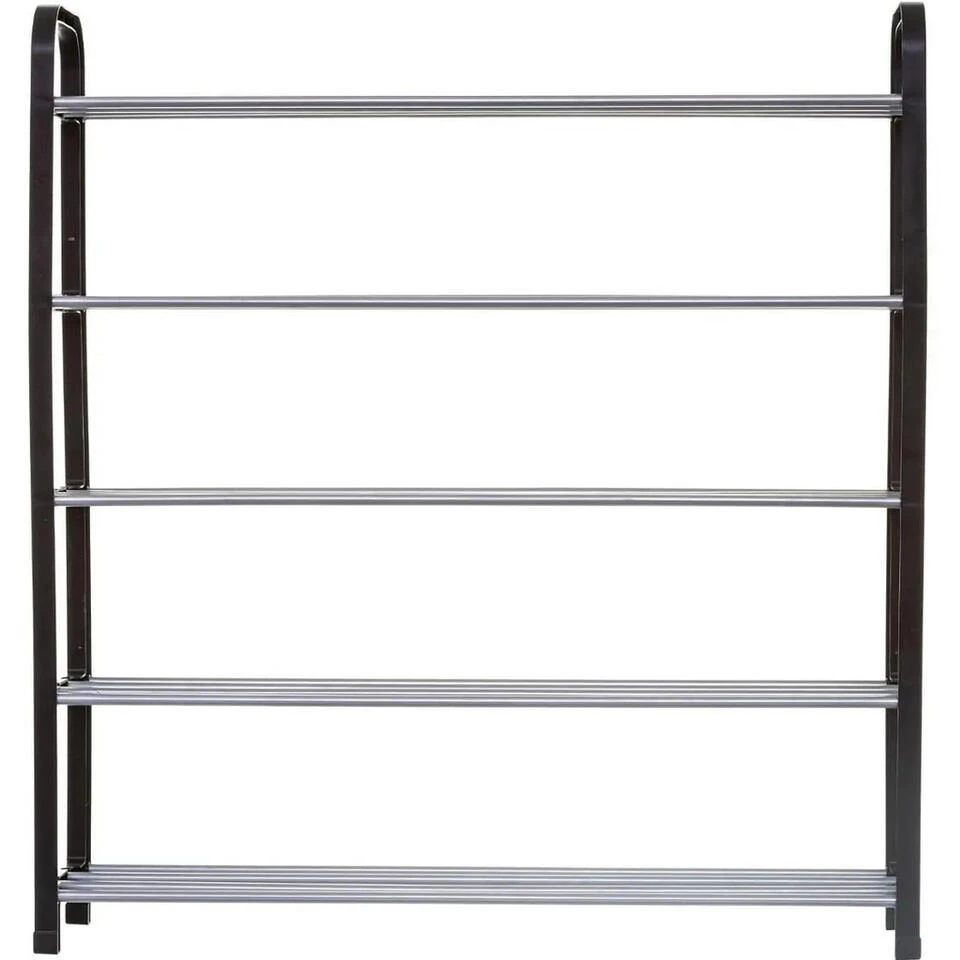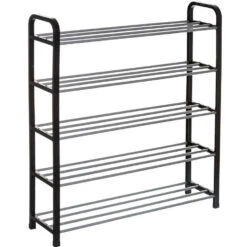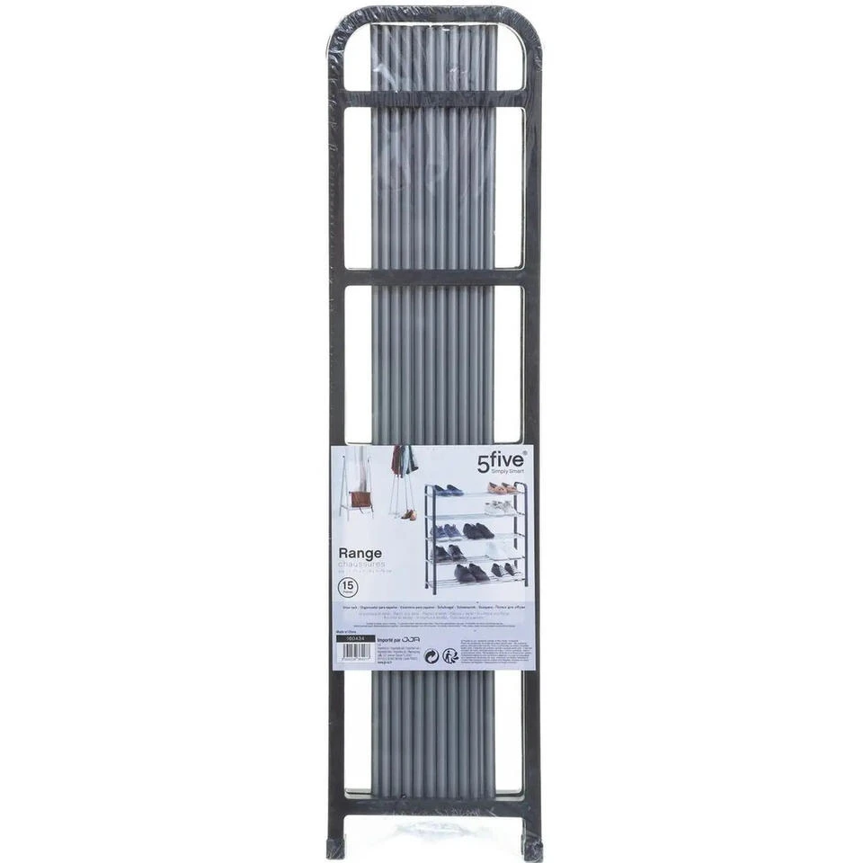 Schoenenrek/schoenenkast zilver/zwart 71 x 78 cm van metaal/kunststof. Dit schoenenrek heeft 5 planken en ruimte voor 15 paar schoenen. U dient het rek zelf in elkaar te zetten, bevestigingsmateriaal inbegrepen. Afmeting: ca. 71 x 19 x 78 cm. Materiaal: metaal met kunststof.