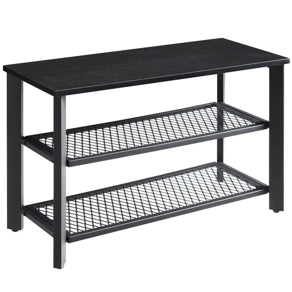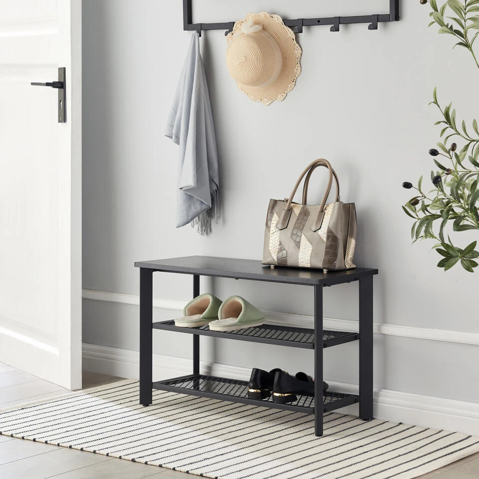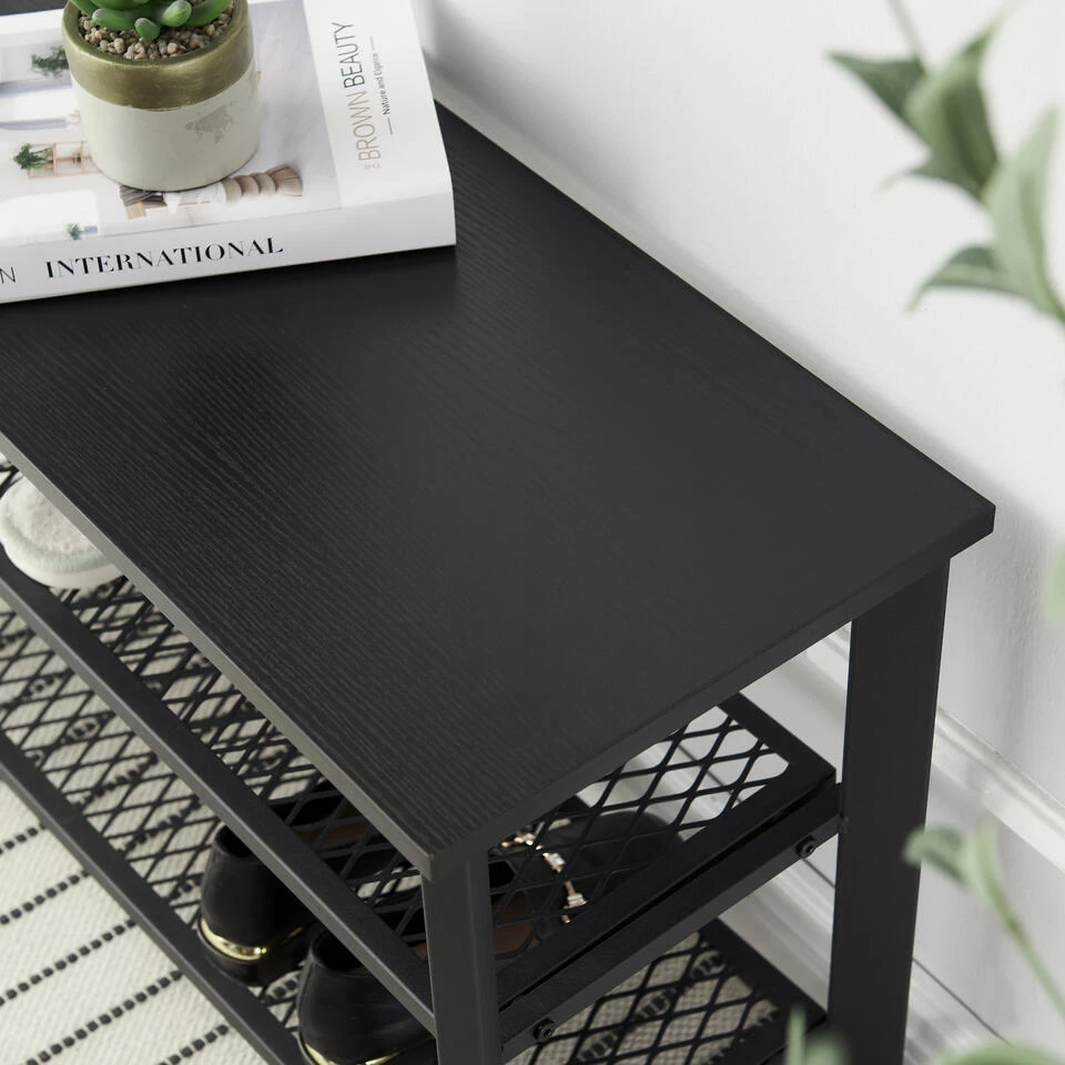 Dit opbergrek heeft 3 niveaus en neemt weinig ruimte in beslag. Het rekje biedt toch een grote capaciteit om je schoenen op te bergen en aan te trekken. De zwarte kleur van het houten blad en het metalen frame zal een strak moderne toets geven aan uw inkomhal, entree of slaapkamer.