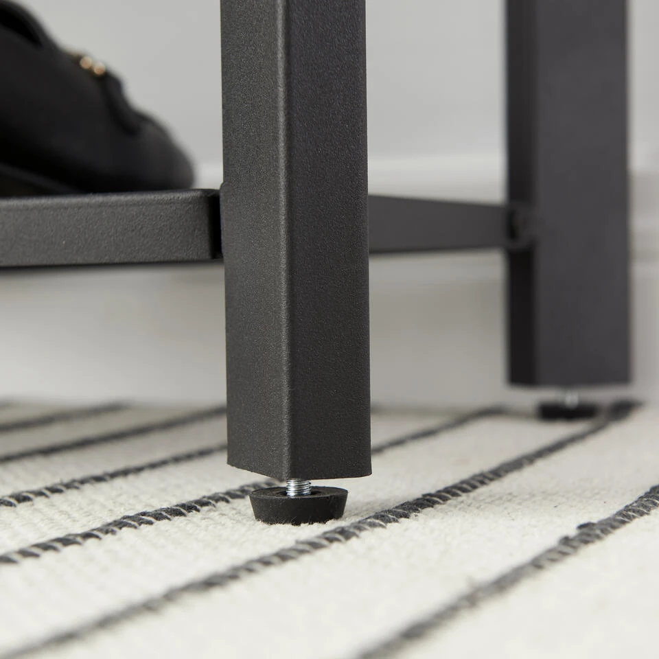 Dit schoenrek met bankje heeft 4 voetjes die voor een goede stabiliteit zorgen, zelfs op een licht oneffen ondergrond. Ze beschermen de vloer ook tegen krassen. Met een draagvermogen van 90 kg kan je rustig je sneakers of andere schoenen aantrekken.
