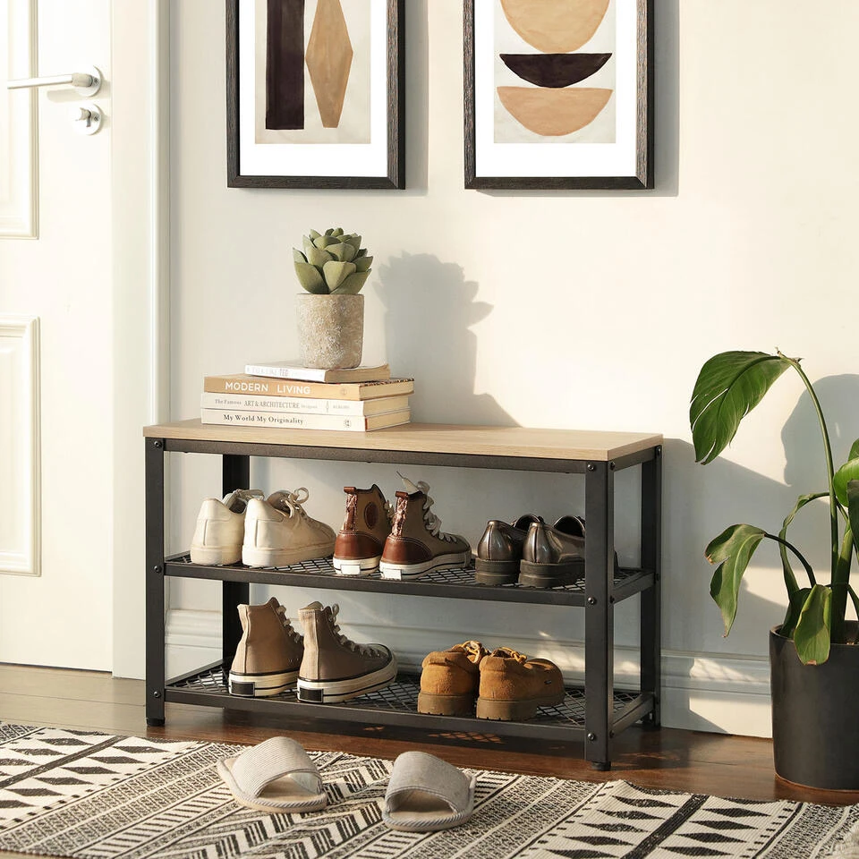 Dit opbergrek heeft 3 niveaus en neemt weinig ruimte in beslag. Het rekje biedt toch een grote capaciteit om je schoenen op te bergen en aan te trekken. De subtiele kleur van licht eiken zal een zuivere en elegante toets geven aan uw inkomhal, entree of slaapkamer.