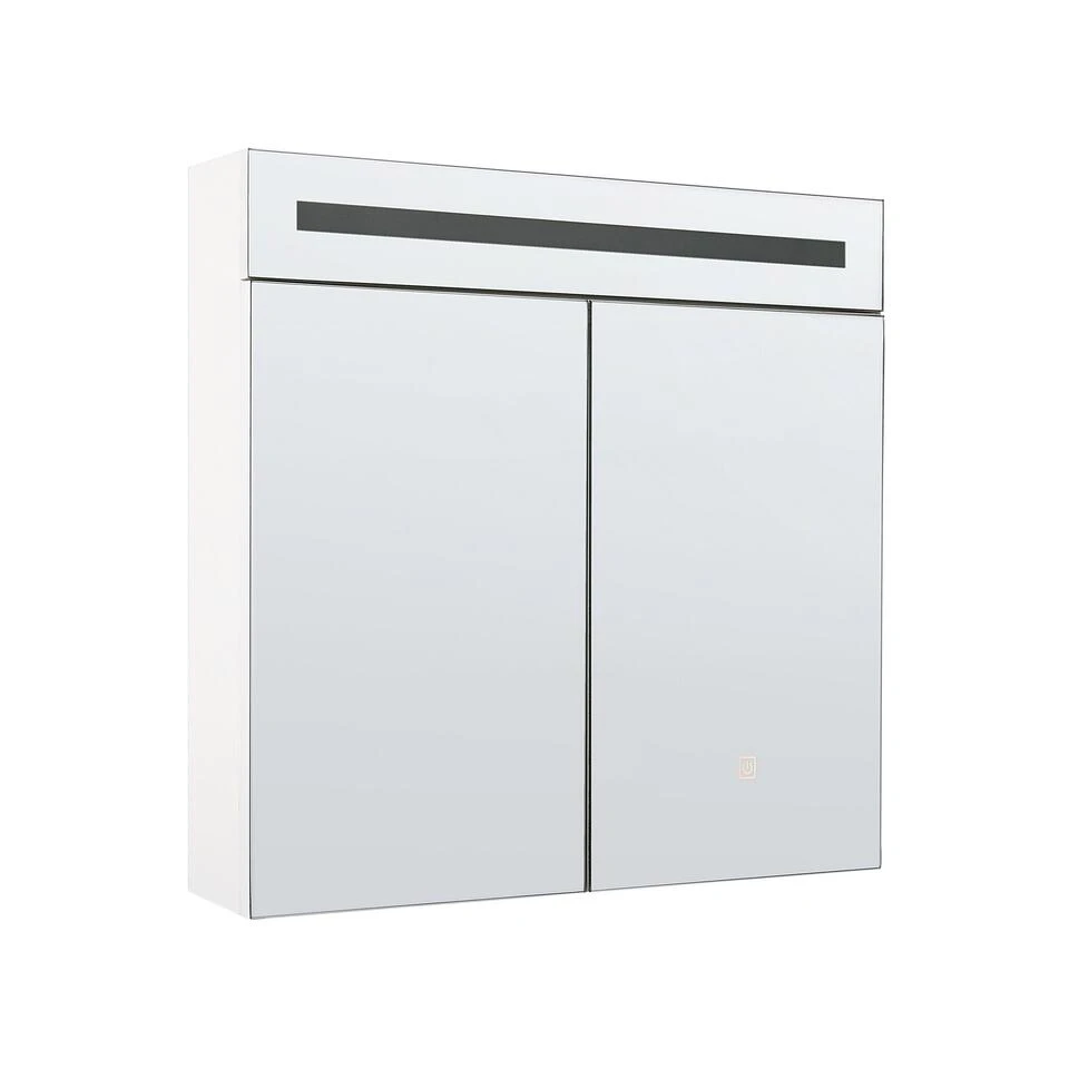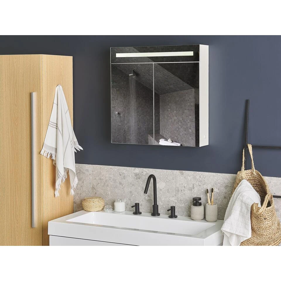 Spiegelkast met LED-verlichting voor de badkamer. Deze praktische badkamerkast is tijdloos en voorzien van een energiebesparende ledstrip. De kast is gemaakt van onderhoudsvriendelijk multiplex en MDF en is ideaal voor vochtige ruimtes. De twee planken in de kast bieden voldoende ruimte voor badkameraccessoires, tandenborstels en scheergereedschap. De zachte scharnieren zorgen ervoor dat de deuren zacht openen en sluiten en met de schakelaar aan de zijkant kun je het licht gemakkelijk in- en uitschakelen.