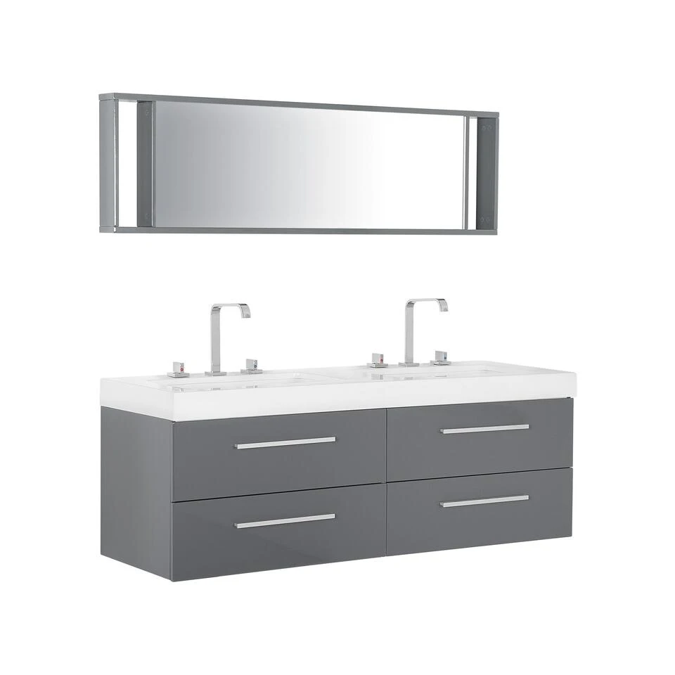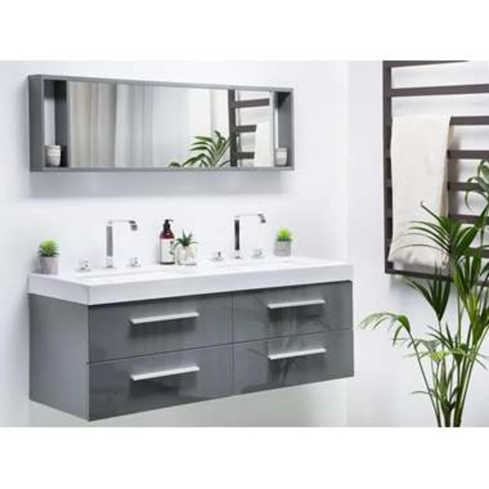 Modern, uitgebreid badmeubelset in grijs. Modern en stijlvol! Dit design badkamerset met een royale dubbele wastafel is een prachtige aanvulling op de inrichting van jouw badkamer. De ladekast, gemaakt van sterk MDF, heeft een melamine coating aan de voorzijde. De vier, soepel uittrekbare, laden hebben een coating van hoogwaardig PVC. De laden zijn uitgerust met een softclose systeem en bieden veel praktische opbergruimte. De brede, aluminium ladegrepen onderstrepen de moderne uitstraling en het strakke design van dit badmeubel. De bijzonder onderhoudsvriendelijke, royale wastafels van gehard wit acryl geven veel ruimte bij gebruik.