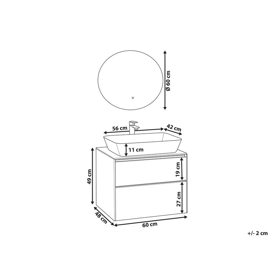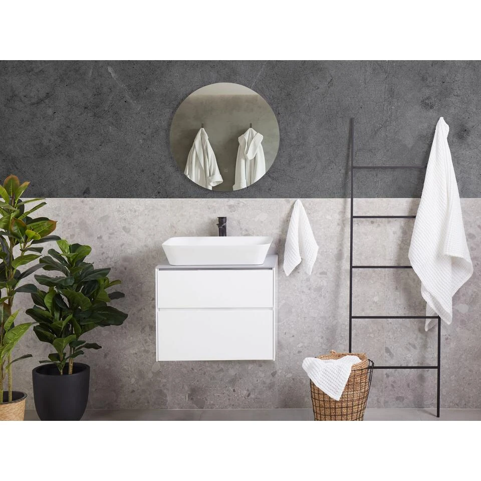 Aan de muur hangende badkamer set met spiegel. Deze enkele wastafel met praktische opbergruimte en spiegel is een perfecte aanvulling op een badkamer met beperkte ruimte. Hij biedt veel ruimte in de twee ruime lades en houdt al je spulletjes netjes uit het zicht. De kast wordt geleverd met een aanrechtblad met een keramische wastafel die is ontworpen voor gebruik met een wandkraan of een kraan die aan het werkblad wordt bevestigd. De LED-verlichte ronde spiegel geeft je wat extra licht voor je hygiëneroutine. Het minimalistische ontwerp en de witgekleurde fronten zorgen ervoor dat de set bij alle interieurstijlen past.