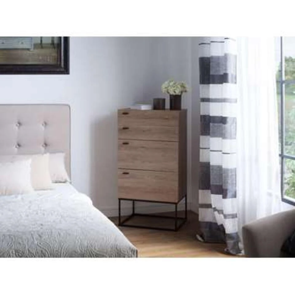 Melkkast in industriële stijl met 4 lades. Het rechtlijnige design en industrieel ontwerp geven deze kast zijn individualistische karakter. Dankzij de hoge, smalle vorm biedt het veel opbergruimte zonder veel ruimte in beslag te nemen. De praktische ladekast kan worden gebruikt in alle woonruimtes en ook in de studeerkamer of op kantoor. Twee kleinere en twee grote laden met smalle handgrepen van zwart metaal zorgen voor orde. De mooie houtkleur wordt gecombineerd met een stevige, gepoedercoat metalen frame in zwart. De kleuren- en materiaalmix van metaal en hout geeft het dressoir zijn trendy en expressieve uitstraling en zorgt ervoor dat het er echt goed uitziet, zowel in moderne en industriële inrichtingsstijlen als in een rustieke ambiance!