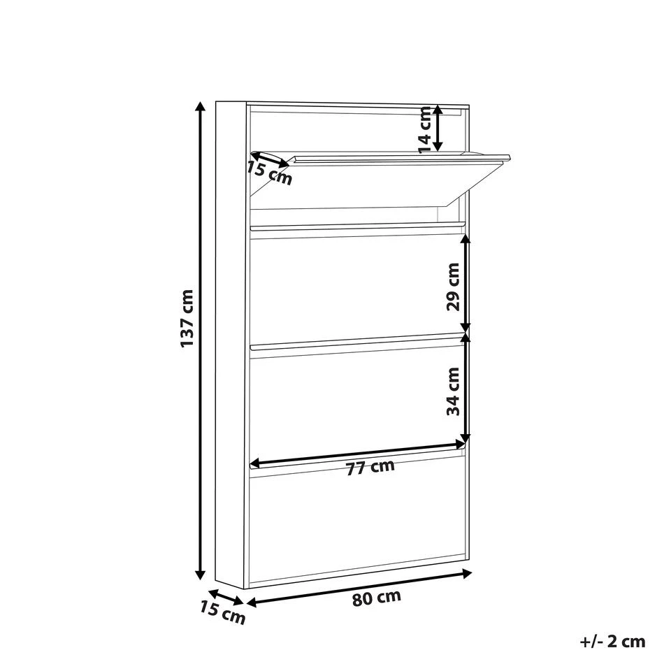 Minimalistische metalen schoenenkast met 4 kleppen. De schoenenkast is uitgevoerd in een elegante grafietzwarte tint en laat een onmiskenbare look achter dankzij de greeploze, gladde frontjes. De 4 praktische opbergvakken voor schoenen kunnen gemakkelijk worden geopend en hun opbergruimte zorgt voor orde in de ingang van je huis. Dit visueel aantrekkelijke meubel ziet er ook prachtig uit als roomdivider. De precieze productie, de robuuste metalen constructie en de onderhoudsvriendelijke oppervlakken maken de schoenenkast tot een hoogwaardig, duurzaam en praktisch accessoire voor jouw woonruimte.