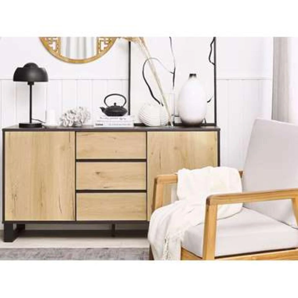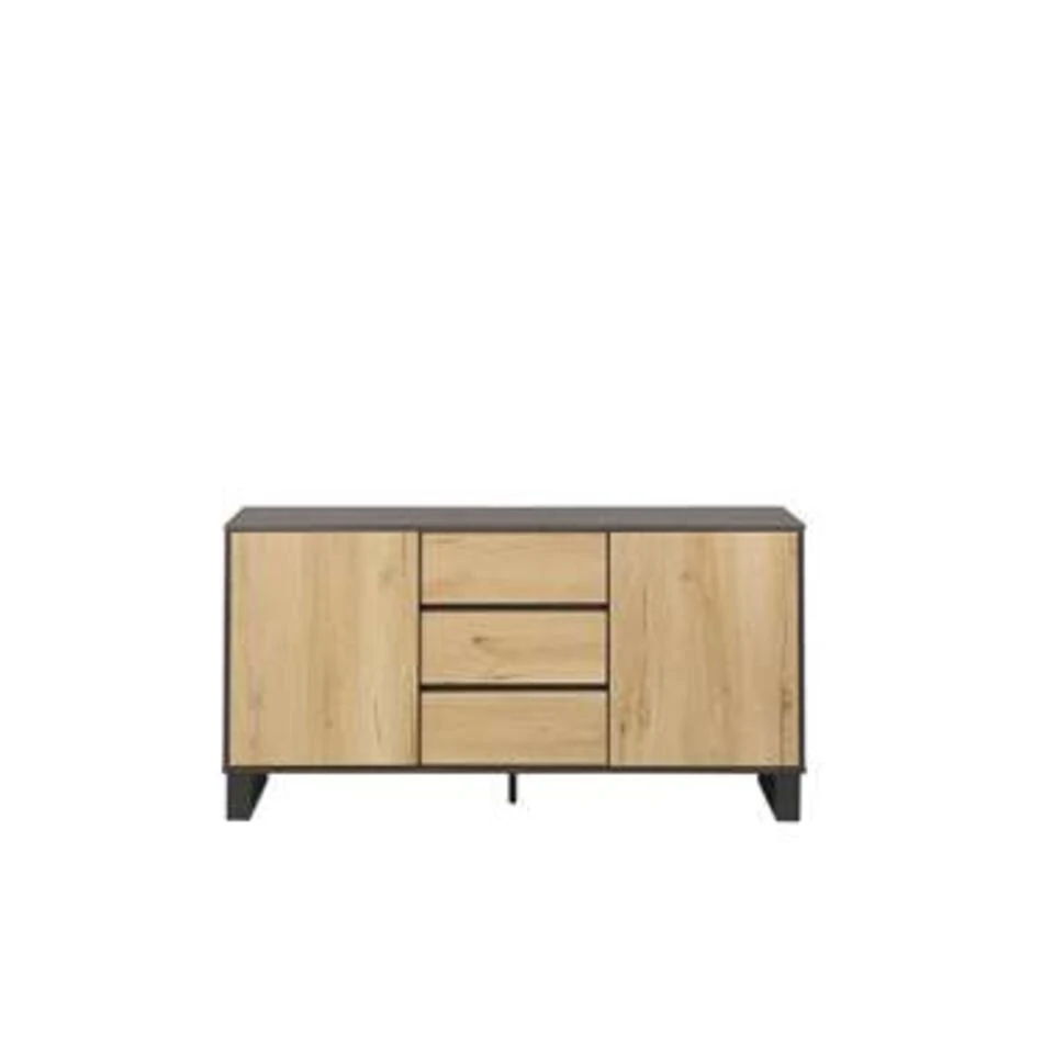 Ruim dressoir met twee kasten en 3 lades. Geef je woon- of slaapkamer een industrieel tintje met dit praktische dressoir. Het dressoir is gemaakt van duurzaam MDF en heeft een prachtige houtlook afwerking. De ladekast staat op een duurzame metalen poot in grijs wat hem een minimalistische uitstraling geeft. De ruime planken en lades van het dressoir helpen je je huis te organiseren en overzichtelijker te maken.