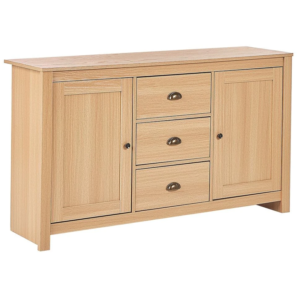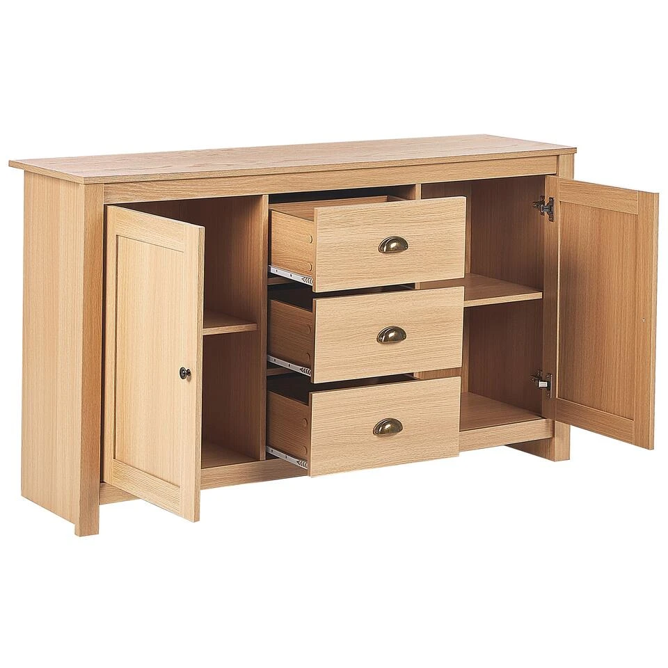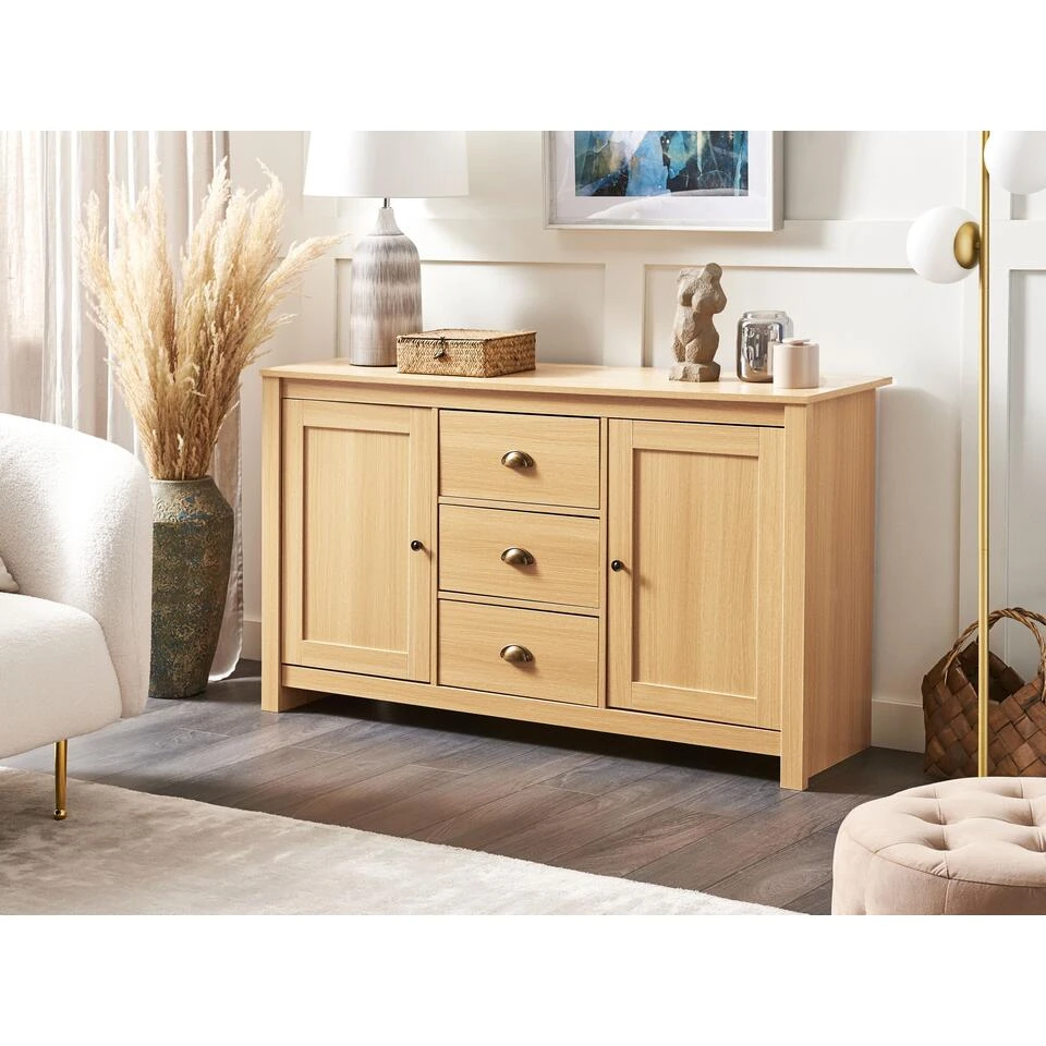 Kast in traditionele stijl met 3 lades. Mooi dressoir in een tijdloos ontwerp dat zeker een aanvulling is op elk interieur met zijn eenvoudige lijnen en warme toon van een houten afwerking. Met twee gesloten kasten en drie lades, met mooie metalen handgrepen, biedt het voldoende opbergruimte. Dankzij zijn klassieke uitstraling is hij een perfecte aanvulling op elke woon- of slaapkamer.