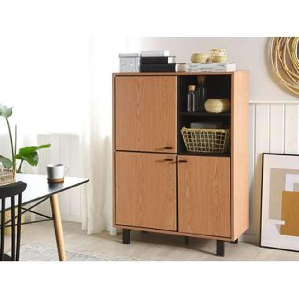 Retro sideboard met houtlook afwerking. Dit elegante dressoir past perfect in een woonkamer in een moderne, industriële of Scandinavische stijl. Het robuuste frame is voorzien van een houtachtige melamine coating en rust op zwarte, metalen poten. Dit dressoir is ontworpen om maximale opbergruimte te bieden en is opgebouwd uit drie grote kasten en twee open planken. Dankzij zijn klassieke houtachtige afwerking en natuurlijke uitstraling past hij in elke woonruimte.