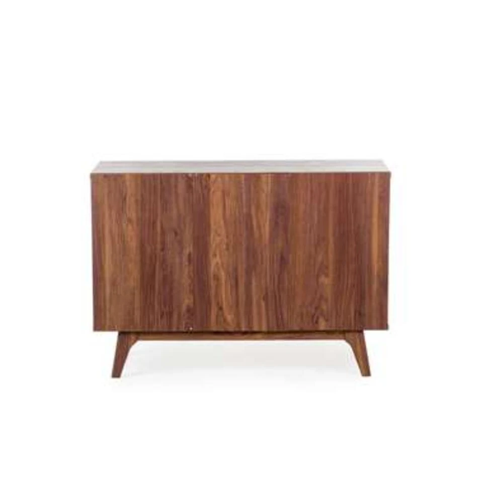 Modern dressoir. Perfectie in functionaliteit en design! Bij dit exclusieve sideboard verrassen functioneel design, de harmonische kleurcombinatie van een warme walnoothouten kleur met klassiek wit en de hoogwaardige kwaliteit. Dit charmante dressoir heeft een warme en tegelijk frisse uitstraling en biedt voldoende opbergruimte. De commode heeft twee ruime vakken met kastdeuren en steeds een in hoogte verstelbare inlegplank. In het midden bevinden zich drie ruime schuiflades.