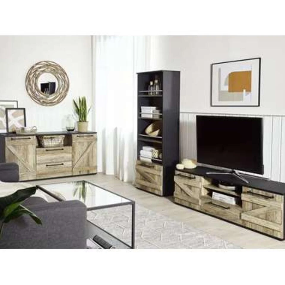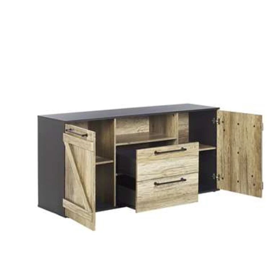 Modern sideboard met veel opbergruimte. Richt jouw woonkamer in in een prachtige schuurstijl. Dit dressoir is een zeer functioneel stuk met zijn ruime kasten en twee laden. De combinatie van lichte houtkleur met nerfeffect en het klassieke zwart maakt het interieur nog stijlvoller. De dwarsbalken op de deuren van de kasten doen denken aan de robuuste, antieke meubels.