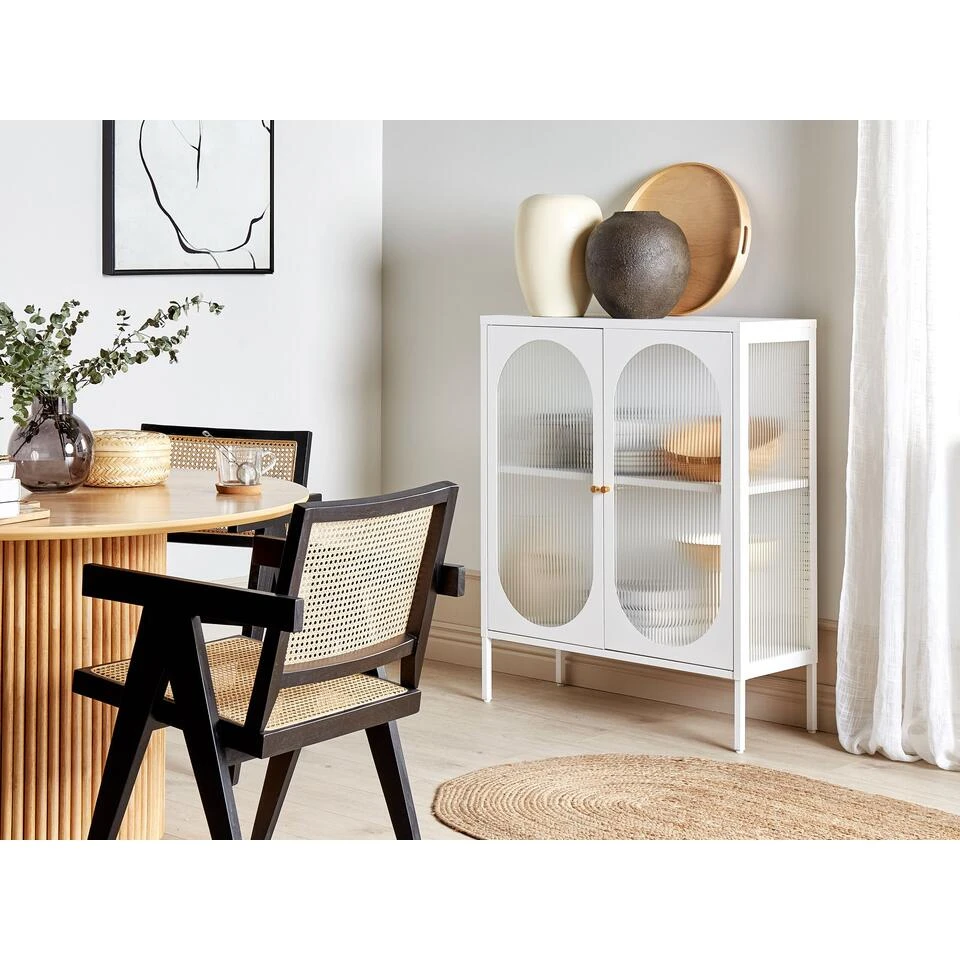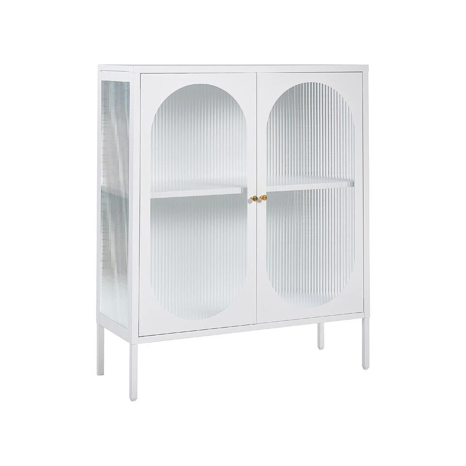 Elegante kast met glazen front. Verfraai je interieur met decoratieve meubelen die de uitstraling van elk ontwerp zullen verbeteren. Dit buitengewone metalen dressoir, dankzij het elegante, glamoureuze gevoel, zal mooi samengaan met andere moderne stukken.