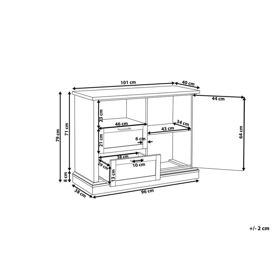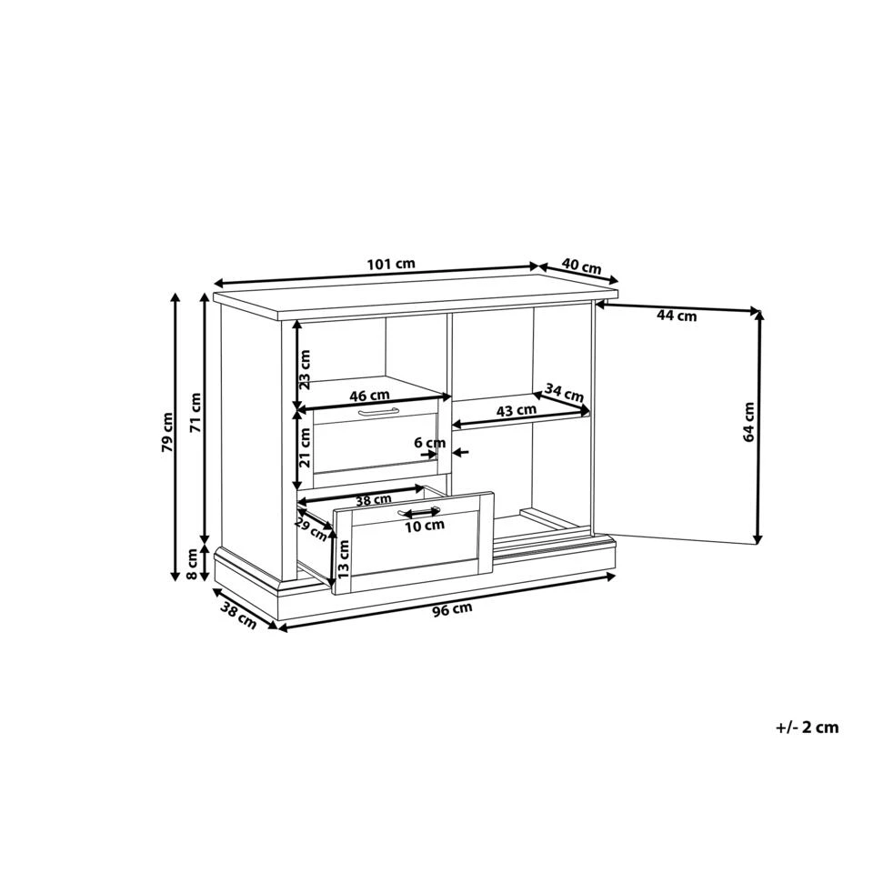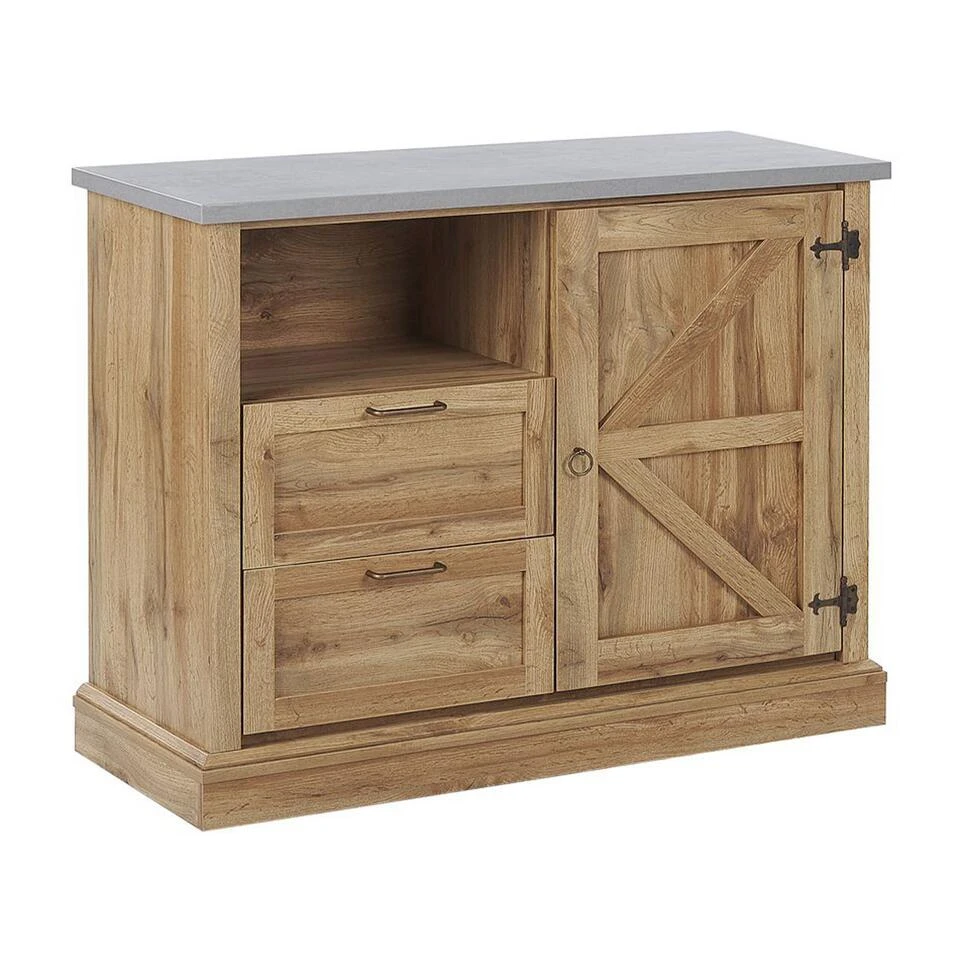 Rustiek sideboard in lichtbruin. Een ladekast, die open en gesloten opslagruimte combineert, past in elke kamer, van de woonkamer tot de keuken. Dit unieke meubelstuk is ontworpen in een rustieke stijl, met fronten versierd met balkachtige latten en gestileerde metalen handgrepen. Een steenachtig aanrechtblad gecombineerd met fronten in een afwerking die eikenhout imiteert, voegt een landelijke charme toe aan het interieur.