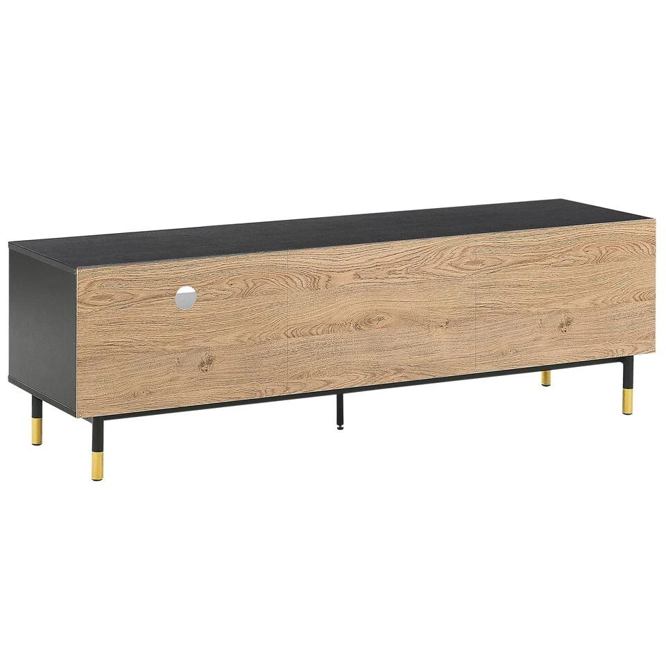 Tijdloos tv-meubel met industriële charme. Dit TV-meubel combineert alles wat belangrijk is in zulke meubels: functionaliteit, design en kwaliteit. Al je elektrische en televisieapparatuur, zoals dvd-spelers, ontvangers en luidsprekers kan je op de plank plaatsen en in de ruime kast past gemakkelijk je hele dvd- en gamecollectie. Dankzij het praktische gat kunnen alle lelijke kabels gemakkelijk achter de tv-standaard worden verborgen. De decoratieve en tegelijkertijd robuuste poten van gepoedercoat metaal in zwart geven dit tv-lowboard een industrieel tintje.