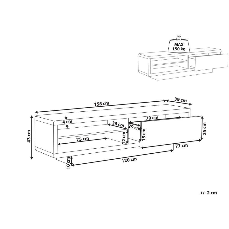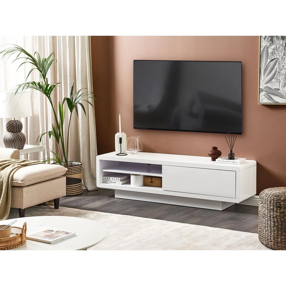 Minimalistische tv-kast met opbergruimte. Maak je woonkamer stijlvol en functioneel met dit lage tv-meubel, met twee open planken waar je al je apparatuur gemakkelijk kan gebruiken dankzij de ingebouwde kabelgoot. De diepe lade is perfect om je afstandsbedieningen, controllers en games op te bergen. De minimalistische kast heeft een hoge glans afwerking wat zorgt voor een moderne look.