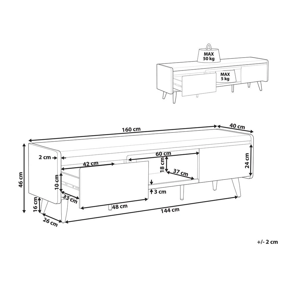 TV kast voor een TV tot 66”. Dit tv-meubel met veel opbergruimte helpt je om de kamer opgeruimd te houden. De ruime lades bieden plaats aan al je extra kabels, documenten en andere belangrijke dingen die je bij de hand moet hebben. Een open plank met een opening voor kabelbeheer is een perfecte plek voor elektrische apparaten. Dankzij het klassieke design en de neutrale kleuren kan deze bijzonder goed gecombineerd worden met traditionele of Scandinavische interieurs. De exclusieve uitstraling wordt geaccentueerd met massief houten poten die extra stabiliteit garanderen.