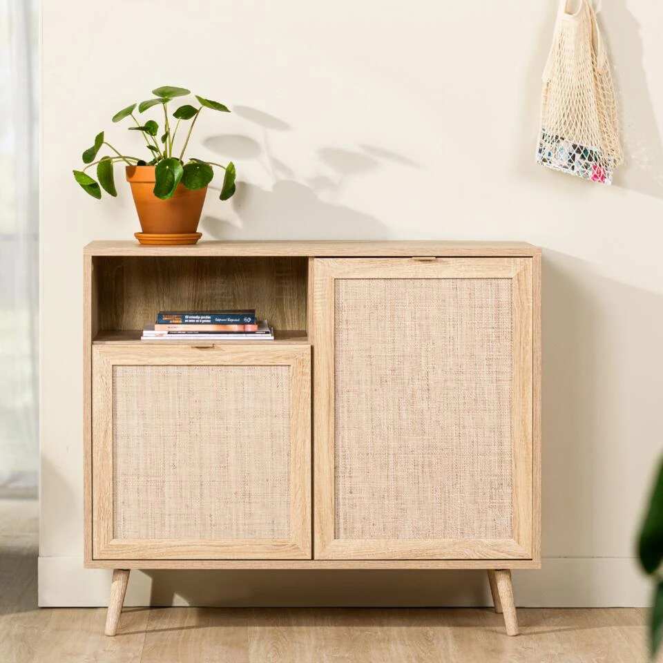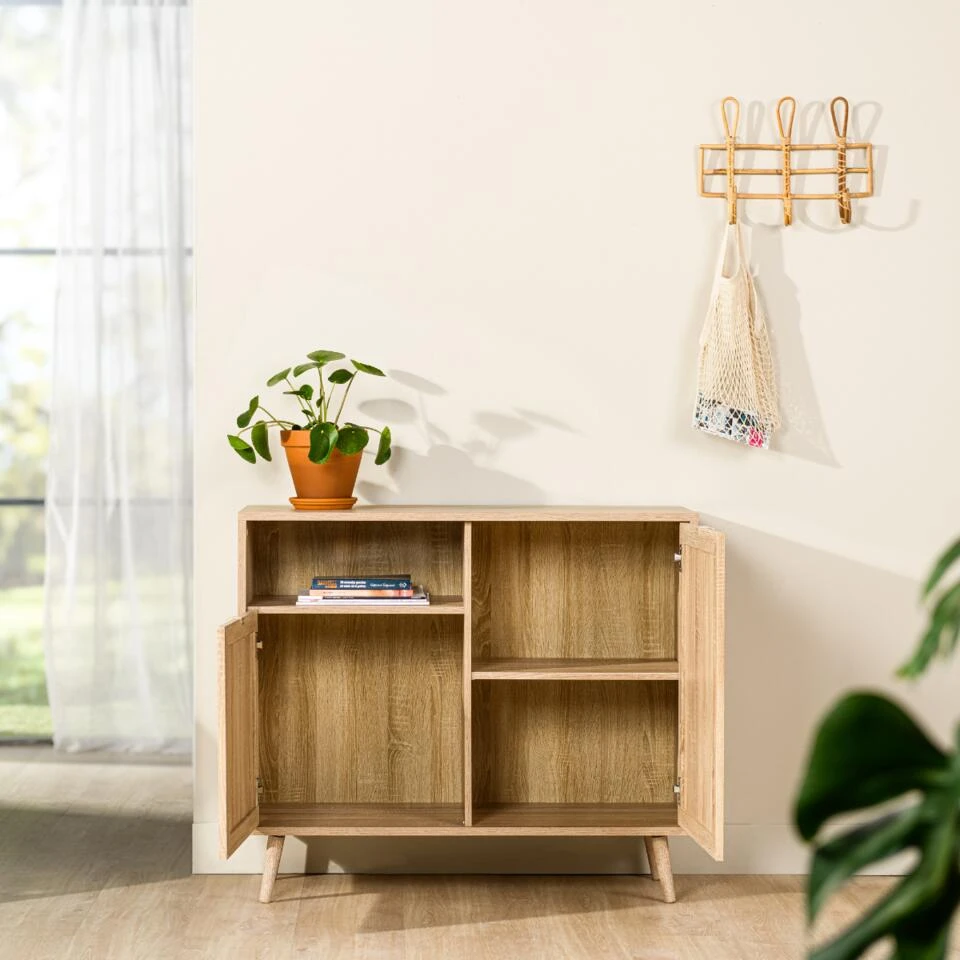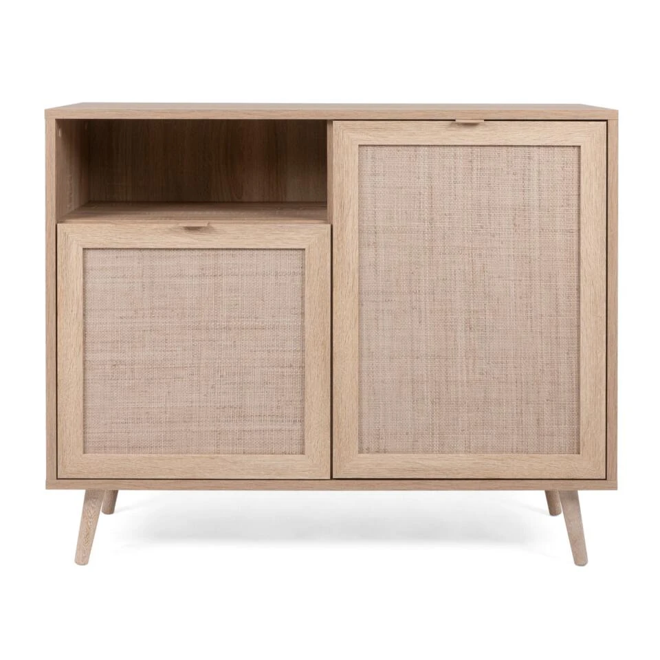 De prachtige Benjamin serie is afkomstig van het geliefde woonmerk Vurna. De serie bestaat uit diverse meubels waardoor je gemakkelijk een eenheid binnen het interieur creeert. De serie valt op door haar natuurlijke uitstraling. Dit komt door het gebruik van MDF in combinatie met een rotanlook. De Benjamin serie bestaat uit een dressoir 150 cm of 180 cm, een wandkast 100 cm of 80 cm, een salontafel en een tv-meubel. Met de serie Benjamin haal je een betaalbare, natuurlijke serie in huis. Breng een zomers gevoel binnen met deze rotanlook serie. De wandkast 100 cm (commode) beschikt over twee deurtjes met drie legplanken en een open vak. Voldoende opbergruimte voor jouw persoonlijke spullen. Creeer gemakkelijk rust binnen het interieur. De wandkast staat vrij hoog op de poten waardoor er gemakkelijk schoongemaakt kan worden rondom de kast.