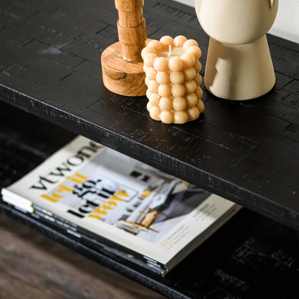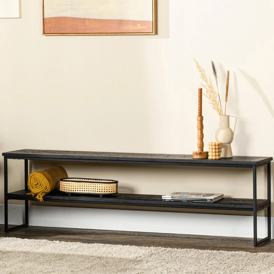 De Bern tv-meubel van Vurna is een stijlvol en modern meubelstuk dat perfect past in elk interieur. Met een lengte van 150 cm is het een perfecte maat voor de meeste woonkamers en biedt het genoeg ruimte om jouw spullen mooi op te bergen of tentoon te stellen. Het meubelstuk is vervaardigd uit gerecycled teakhout en heeft een stevig metalen frame. Dit zorgt ervoor dat het meubelstuk niet alleen duurzaam is, maar ook een stoer en industrieel karakter heeft. De complete uitvoering in de kleur zwart geeft het tv-meubel een moderne uitstraling en maakt het geschikt voor verschillende woonstijlen. Het tv-meubel is voorzien van twee ruime planken waardoor er genoeg ruimte is om jouw spullen netjes op te bergen of tentoon te stellen. Je kunt er echter ook voor kiezen om jouw televisie erop te plaatsen, dankzij de ruime afmetingen en stevige constructie. Het is dus niet alleen een praktische oplossing, maar ook een mooie toevoeging aan jouw interieur. Door de neutrale kleur en moderne afwerking van het tv-meubel, kan het gemakkelijk worden geplaatst in verschillende woonstijlen. Het kan dienen als een centraal element in een moderne woonkamer, maar kan ook perfect geïntegreerd worden in een meer traditioneel interieur. Het meubelstuk zal zonder twijfel de aandacht trekken en een opvallende toevoeging zijn aan jouw ruimte. Bern is verkrijgbaar in verschillende uitvoeringen, kijk hiervoor op onze website.
