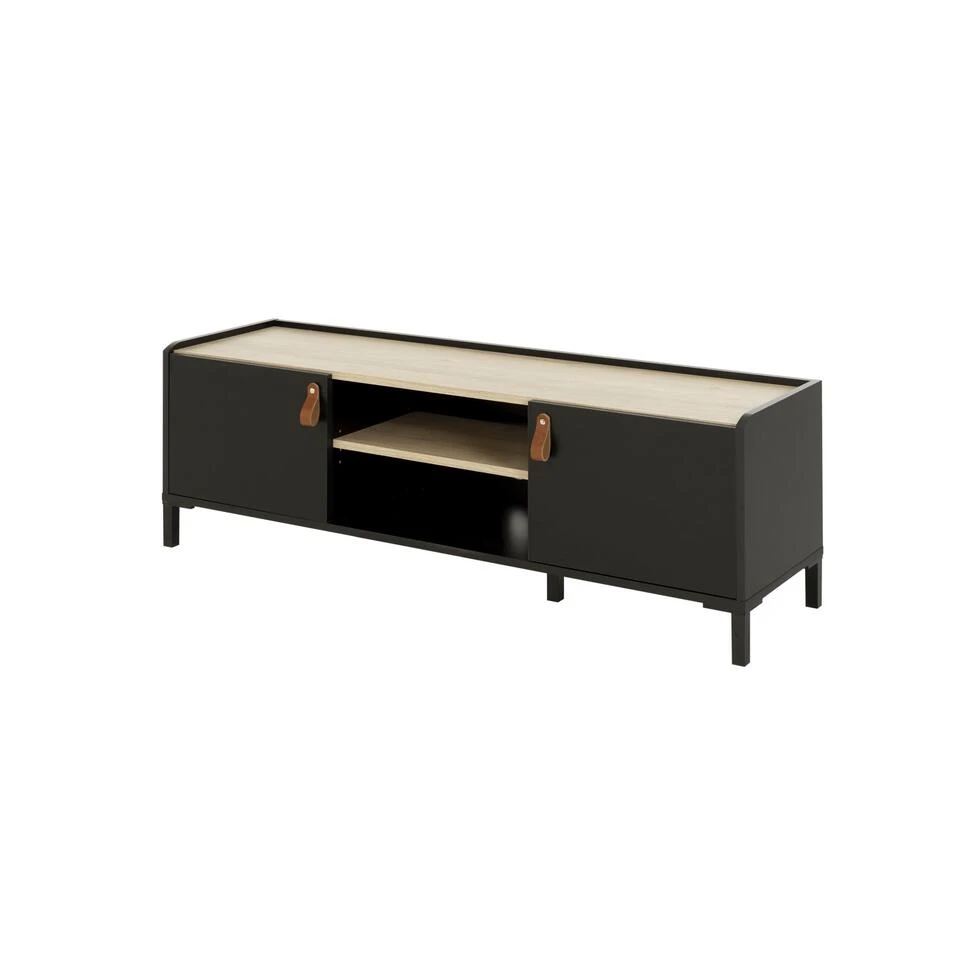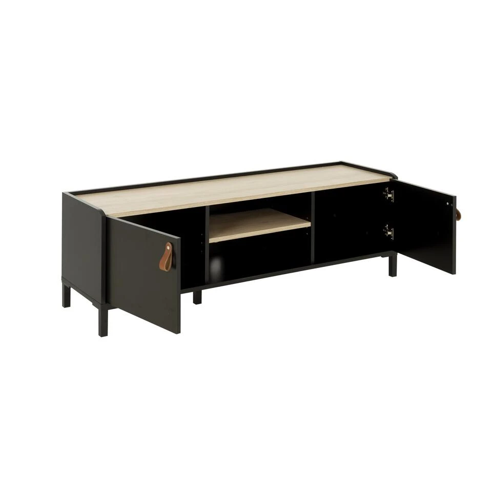 De TV-kast heeft twee deuren en twee nissen in het midden om uw elektronische apparaten, boeken, tijdschriften en andere dagelijkse voorwerpen op te bergen. De bruine leren handgrepen en de matzwarte ABS-poten voegen een vleugje verfijning toe aan het geheel.