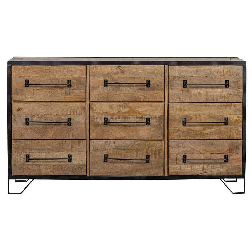 Dit dressoir Baltimore heeft 9 lades die genoeg ruimte bevatten om allerlei eigendommen overzichtelijk op te bergen. Het dressoir is gemaakt van warm mangohout en de lades hebben een stoer van metaal gemaakt handvat, waardoor deze fraaie kast door iedereen zal worden gewaardeerd. Op de bovenkant kunnen vele decoratieve voorwerpen geplaatst worden om de kamer nog fraaier te maken.