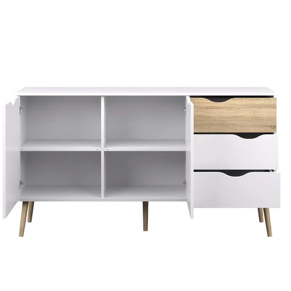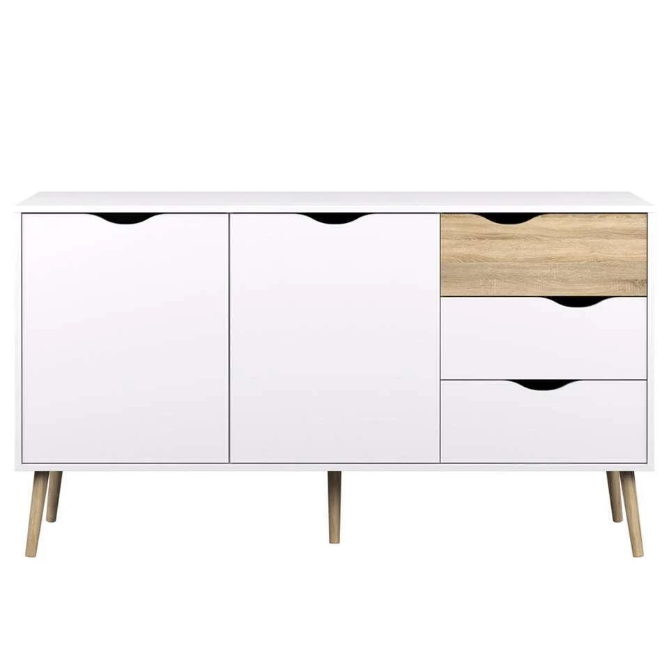 Dressoir Delta is een moderne kast met 5 vakken. De 5 vakken zijn opgedeeld in 2 deuren en 3 lades. Deze witte/eikenkleurige kast heeft genoeg ruimte voor al je spullen! Wil je liever een kleinere Delta kast? Geen probleem, dressoir Delta is er ook in een 3-vaks.