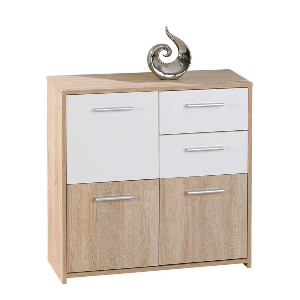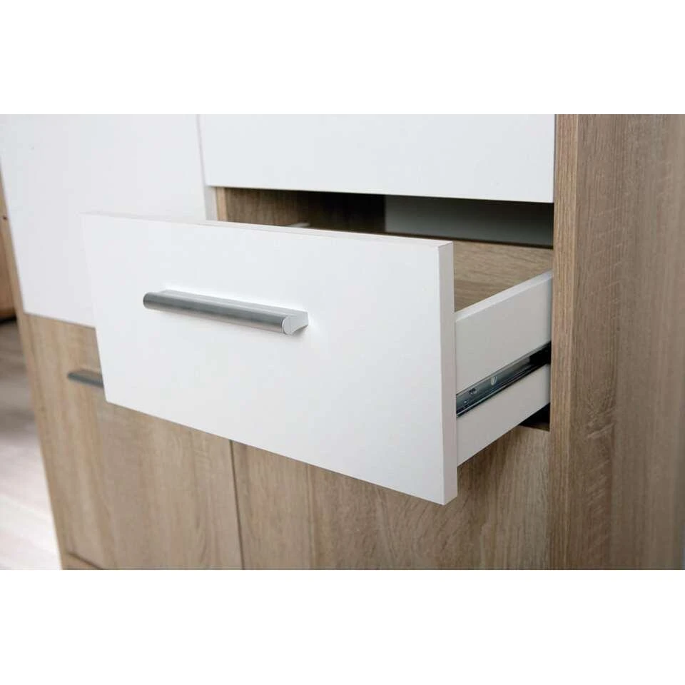 Dressoir Eboli is een wandkast die speels omgaat met kleurverdeling. De deuren en lades zijn een combinatie van Sonoma eikenhout met wit. Alle opbergvakken zijn voorzien van afgeronde RVS grepen. De lades hebben geleiders voor extra gebruiksgemak. Dressoir Eboli is gemaakt van spaanplaat met en sterk en tijdloos karakter. Drie deurtjes en twee lades met voldoende opbercapaciteit. De kast kan in verschillende ruimtes worden geplaatst. Hierbij kun je denk en aan de gang, garderobe, woonkamer of slaapkamer.