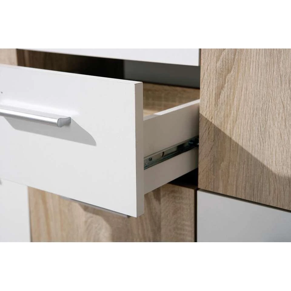 Commode Elvezia is een ladekast die speels omgaat met kleurverdeling. De deuren en lades zijn een combinatie van Sonoma eikenhout met wit. Alle opbergvakken zijn voorzien van afgeronde RVS grepen. De lades hebben geleiders voor extra gebruiksgemak. Kast Elvezia is gemaakt van spaanplaat met en sterk en tijdloos karakter. Vijf deurtjes en twee lades verschaffen je meer dan genoeg opbergruimte. De kast kan in verschillende ruimtes worden geplaatst. Hierbij kun je denk en aan de hal, garderobe of woonkamer.