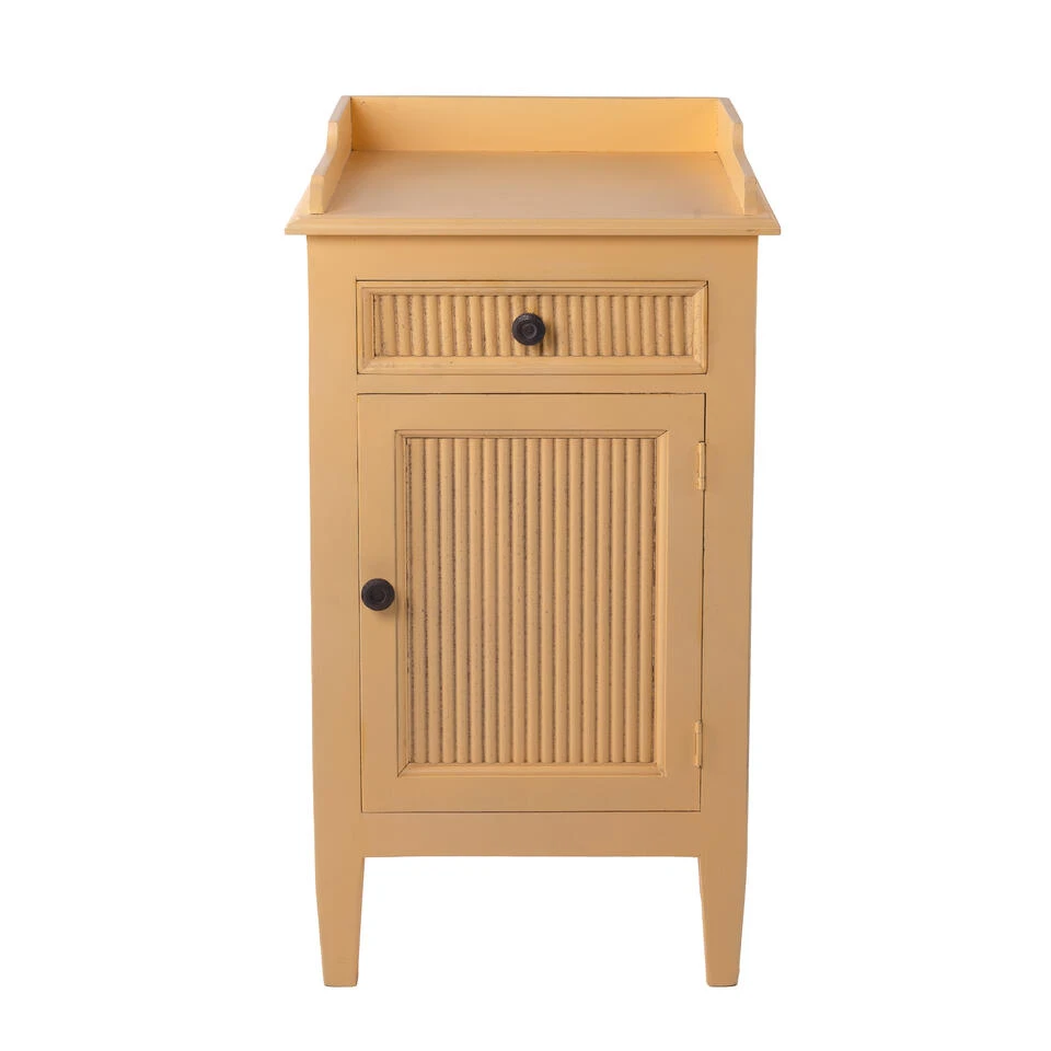 Het compacte houten dressoirtje heeft een deurtje met daarachter een legplank en een lade voor al je kleine prulletjes. Bijzonder is ook het opstaande randje van het bovenblad dat ‘m nét even anders maakt. Dit kleine gele brocante kastje heeft een zwart broertje en twee witte en roze tweelingzusjes die er door hun kleur meteen compleet anders uitzien! Toppertje, toch? Dus waar gaat ‘ie je leven wat zonniger maken? In je keuken, woonkamer, hal, of – en daar zien we ‘m vaak! – op de plek waar het allemaal gebeurt; als nachtkastje naast je bed?