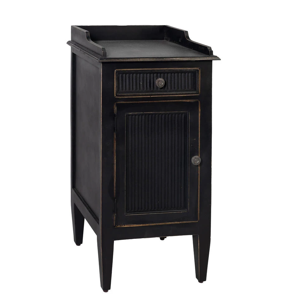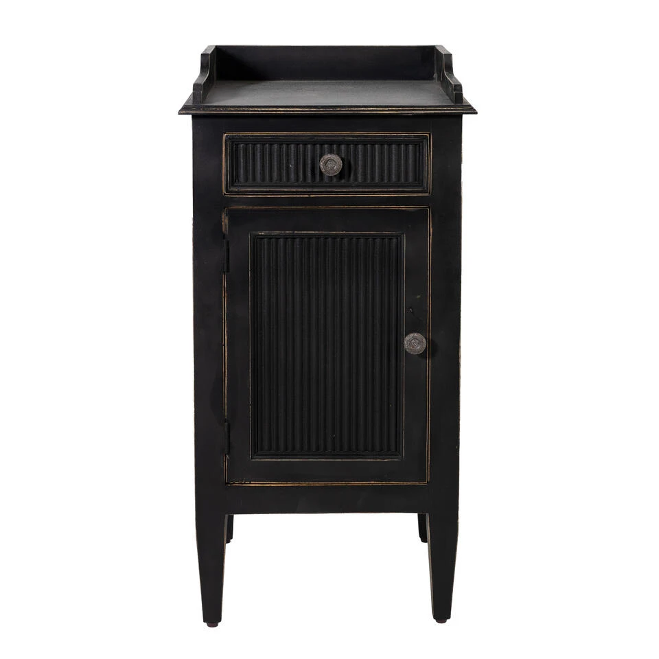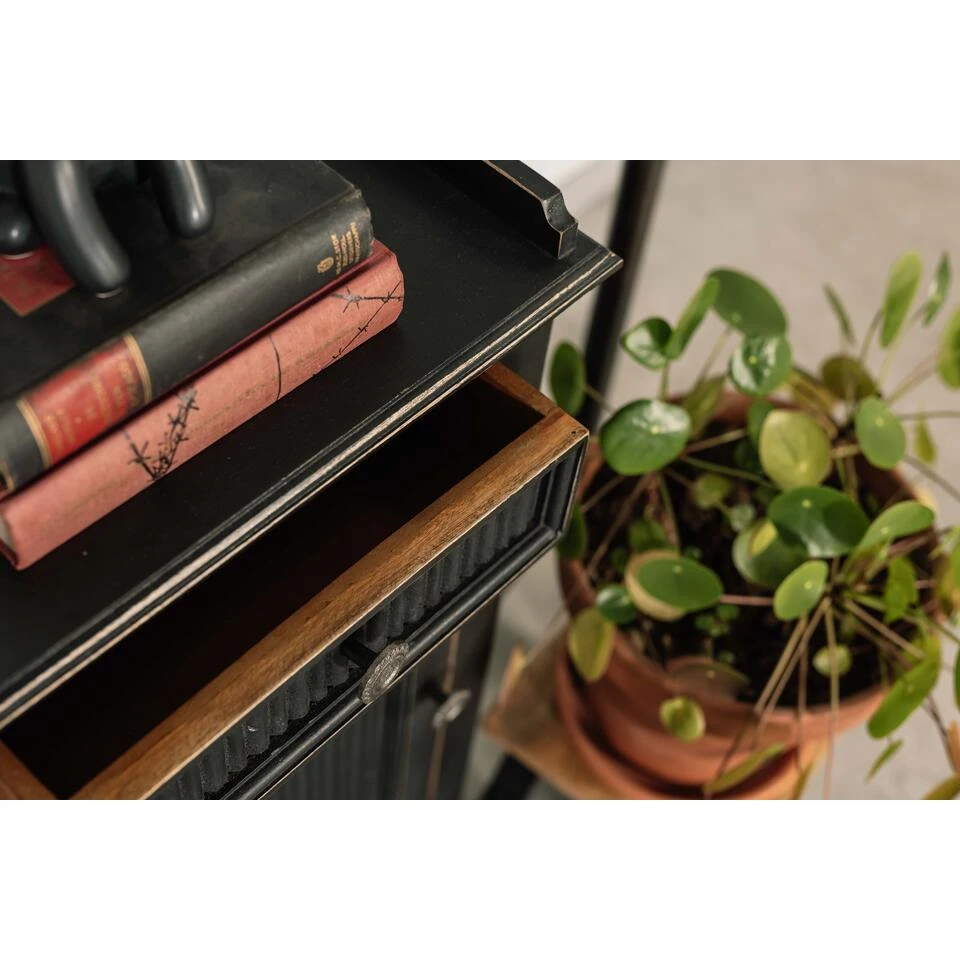 Met een bescheiden formaat van 46,5 centimeter breed en 91,5 centimeter hoog maakt dit dressoir een groots statement. Het charmante ribbeltje in de deur en lade geeft het kastje een eigenzinnige uitstraling. En wat dacht je van de glazen, gedetailleerde knoppen? Een onverwachte, maar geweldige toevoeging aan dit diepzwarte dressoir!