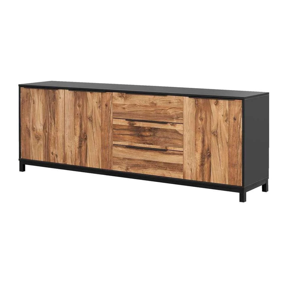 Dit dressoir is er een uit de serie Luc. Dressoir Luc heeft een landelijk stoere look en heeft een antracietgrijs frame. De frontjes van de kastjes en lades hebben een stoere eikenkleur. Deze kast beschikt over drie ruime lades en drie deuren. In dit handige en veelzijdige dressoir heb je veel opbergruimte voor bijvoorbeeld serviesgoed en bestek. Zet er leuke accessoires zoals fotolijstjes op en het geheel is compleet.Â
