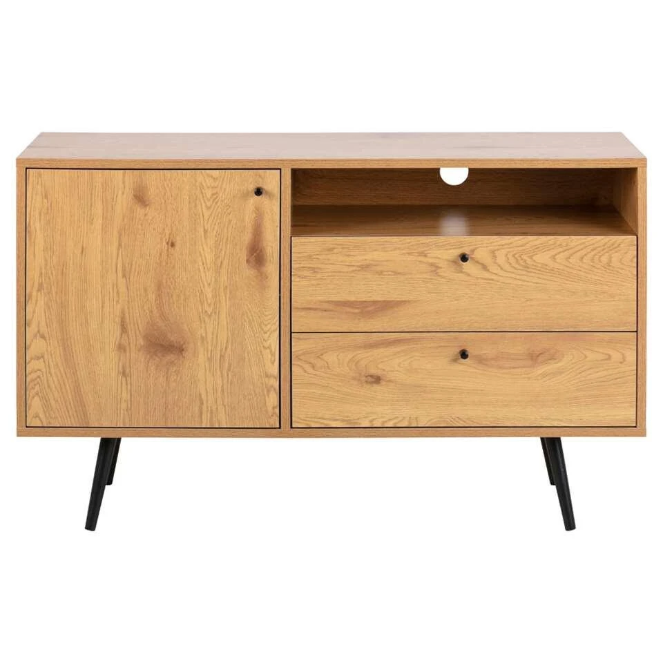Dressoir Melfi past perfect in een interieur met een Scandinavische look. Het dressoir is gemaakt van metaal en MDF. Dit dressoir heeft één deurtje, twee royale lades en een open vak met een opening voor het netjes wegwerken van kabels. De pootjes zijn gemaakt van zwart metaal. In de kast is voldoende ruimte voor alles wat je uit het zicht wilt opbergen. Bovenop deze wandkast is ruimte voor bijvoorbeeld leuke fotolijstjes, vaasjes en kandelaars. Deze stijlvolle kast verdient een prominente plek in je interieur.