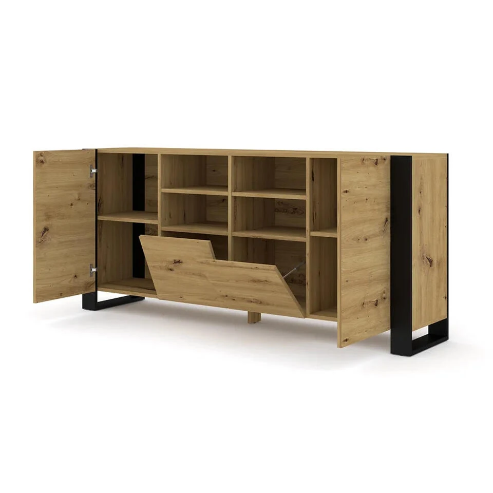Zeer elegante en stijlvolle ladekast voor woon- of slaapkamer, uitgevoerd in modieuze en natuurlijke kleuren. Hij wordt gekenmerkt door een moderne en oogstrelende uitstraling – zijn charme wordt bepaald door grote zwarte poten in de vorm van een frame, die contrasteert mooi met de rest van het meubilair.De kast heeft vier gesloten en vier open ruimtes.De ladekast is gemaakt van een gecertificeerde ecologische CARB-plaat met verminderde formaldehyde-emissie.
