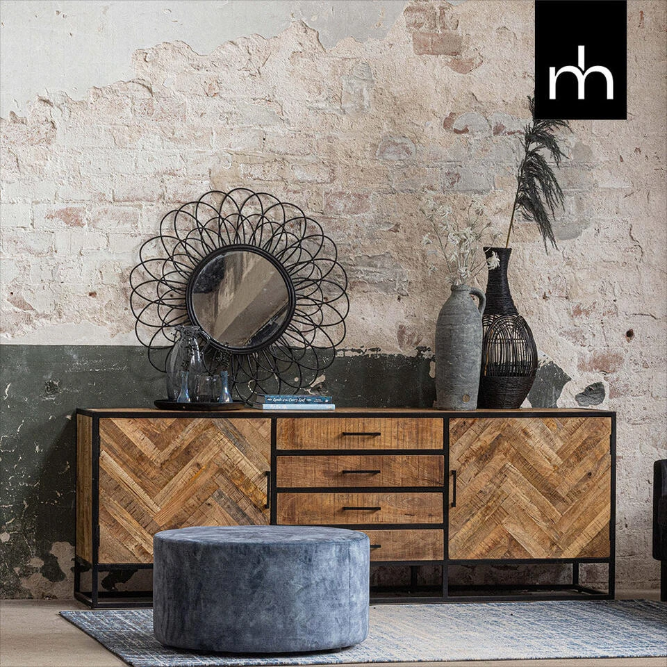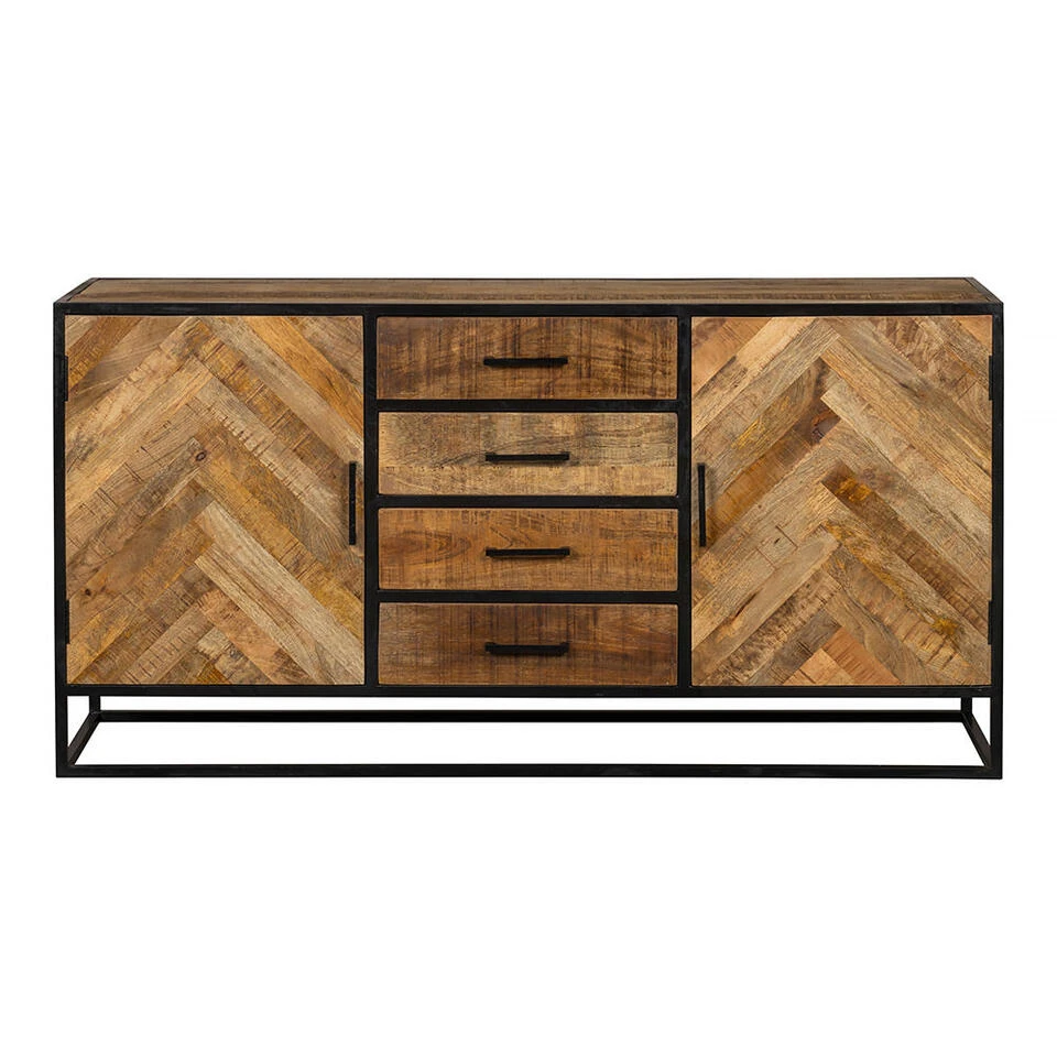 Dit mangohouten dressoir New Haven is anders dan onze andere dressoirs doordat de deurtjes behandeld zijn met een elegant visgraatmotief. De kast bestaat uit twee vakken achter elke deur met ertussen vier lades om de eigendommen op te bergen. Gebruik misschien ook nog planten of kaarsen op het bovenblad om de ruimte nog meer kleur te geven!