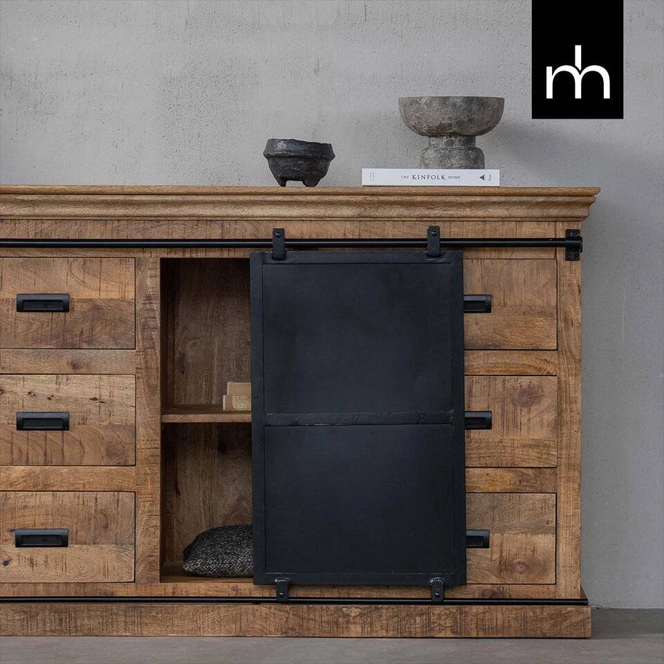 Dit stoere, robuuste dressoir wilt iedereen wel hebben! Het meubel heeft dankzij het warme mangohout en zwartmetalen accenten een krachtig karakter dat moeiteloos in ieder interieur past! Het dressoir bevat zes lades om kleinere accessoires op te bergen met in het midden twee vakken die afgedekt worden door een stalen schuifdeur.