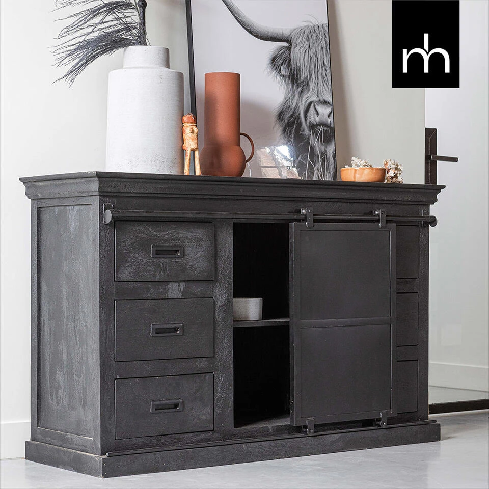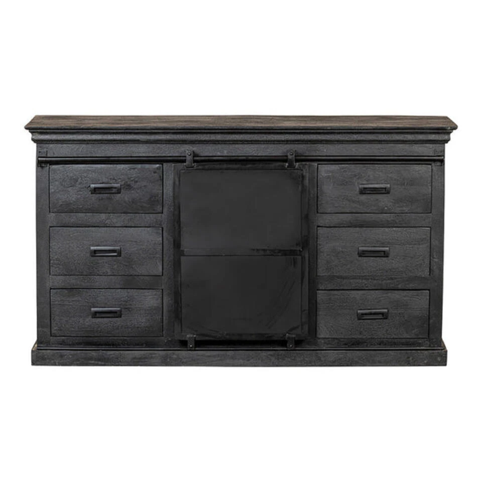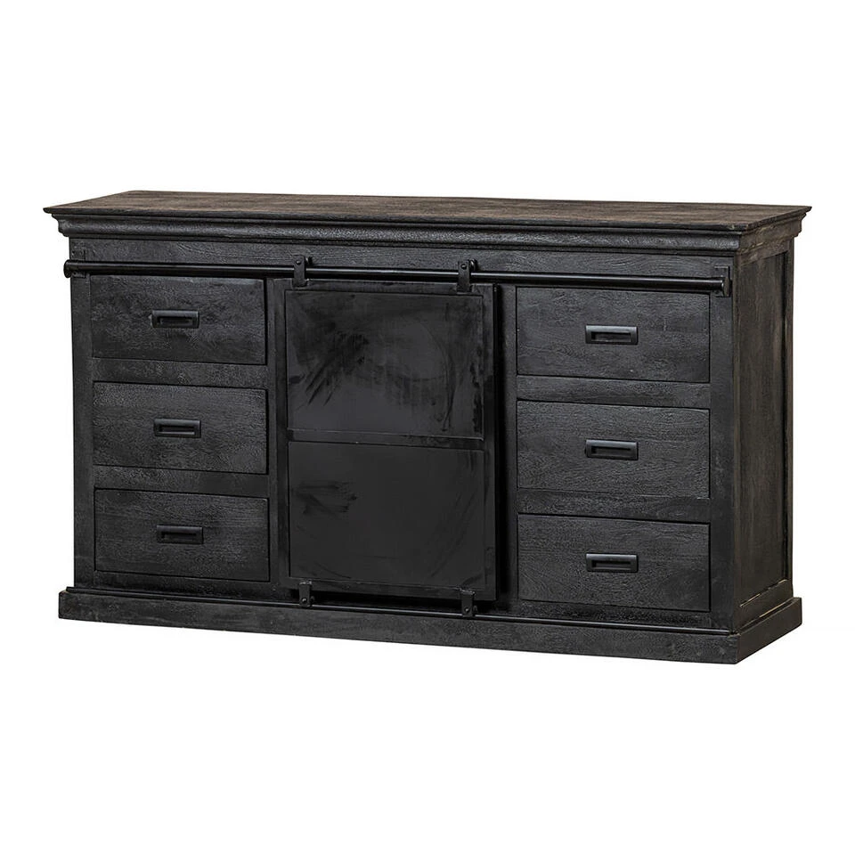 De mangohouten dressoirs uit de Newark Black collectie zijn de nieuwste in haar soort! Dit dressoir van 140 cm breed is stoer en stijlvol tegelijk. Door de zwarte afwerking van het mangohout, krijgt het dressoir een enorm luxe uitstraling. Het dressoir bestaat uit zes lades met in het midden twee open vakken die afgedekt worden door een metalen schuifdeur om allerlei eigendommen op te ruimen.