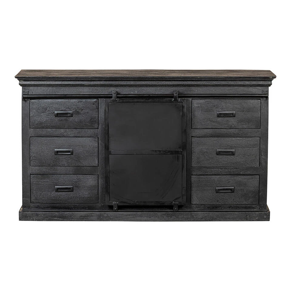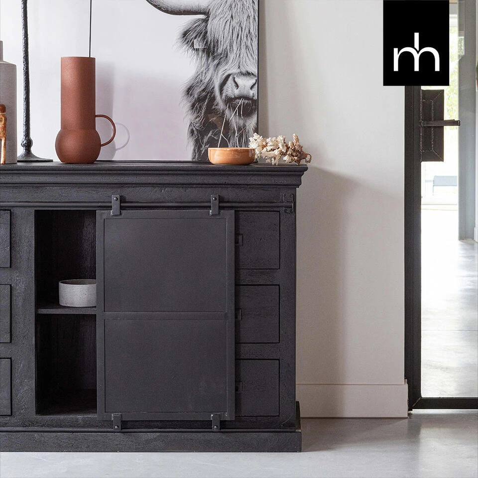 De stijlvolle zwarte dressoirs uit de Newark-collectie bieden u alleen nog maar meer keuze voor het perfecte interieur! Het mangohout heeft een zwarte afwerking en in combinatie met het zwarte metaal vormt dit een fraai geheel te midden van uw interieur. De kast beschikt over zes lades en twee vakken achter de stalen schuifdeur om dingen op te bergen.