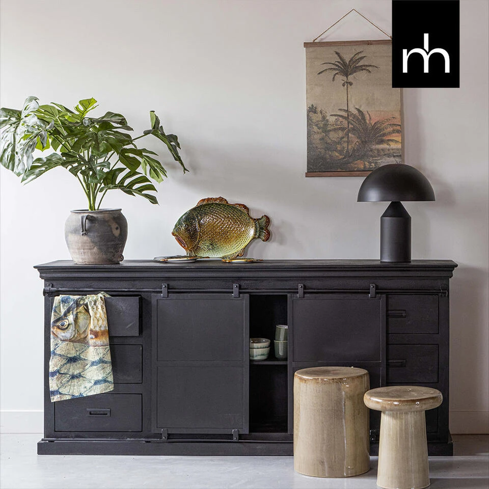 Het mangohout is massief en is eerst gezandstraald, waarna het behandeld wordt met zwarte verfbeits en tenslotte wordt afgewerkt met een donkere, natuurlijke bijenwas om het hout te beschermen tegen vocht, vuiligheid en kringen. De schuifdeuren, de rails en de handgrepen van de lades zijn gemaakt van zwart gepoedercoat metaal.