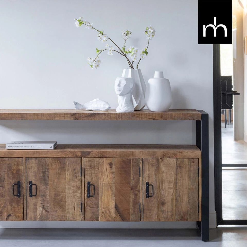 Het Pittsburgh-dressoir is een stoer dressoir met genoeg opbergruimte zowel in als uit het zicht door middel van de ruimte achter de vier deurtjes en de tussenruimte. Het dressoir is ook zeer geschikt als hoog tv meubel door de open tussenruimte, die benut kan worden om geluidsboxen of andere apparatuur te plaatsen.
