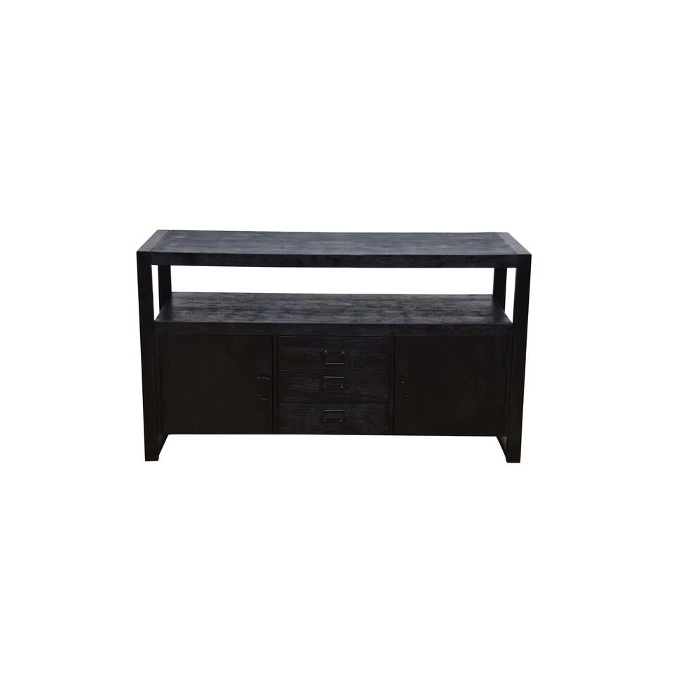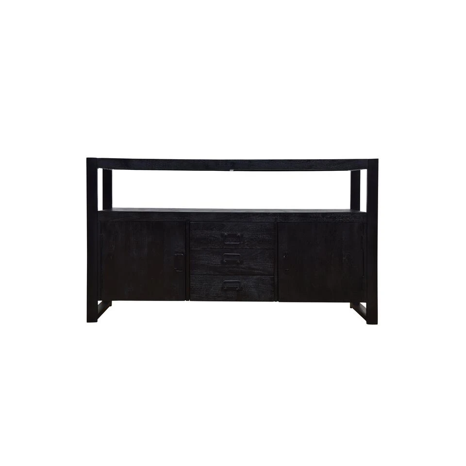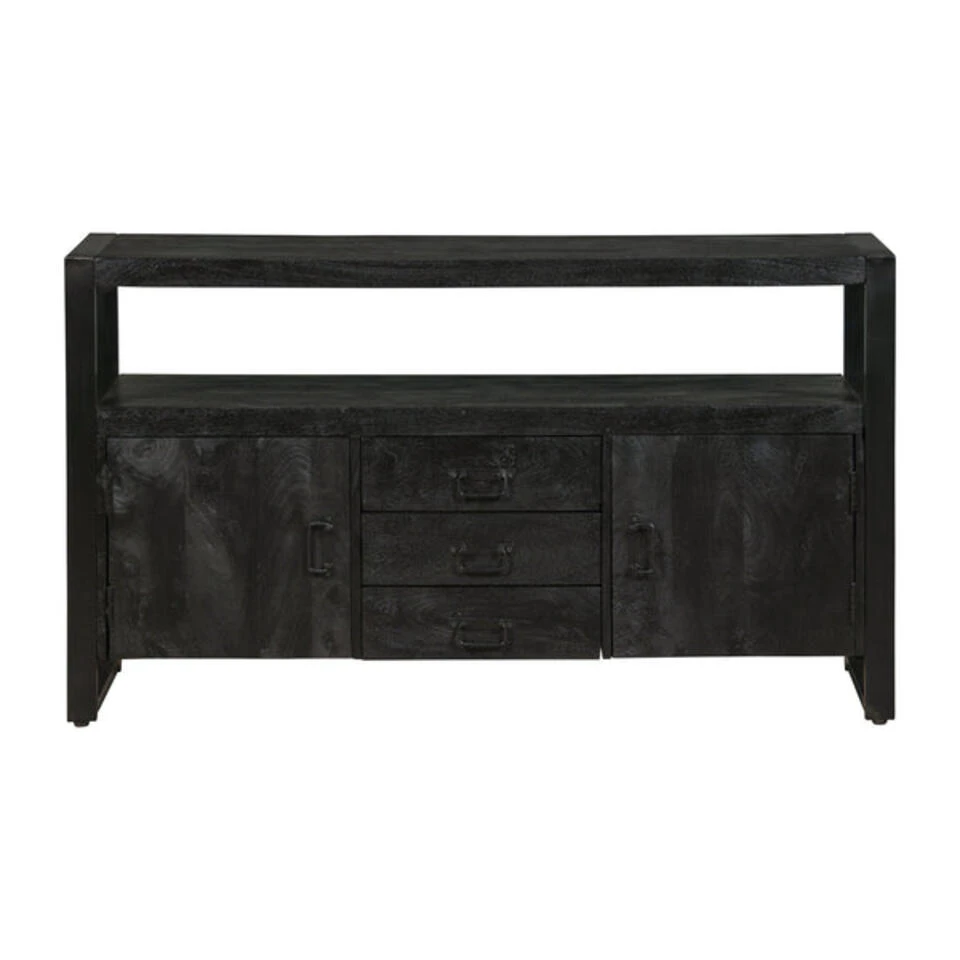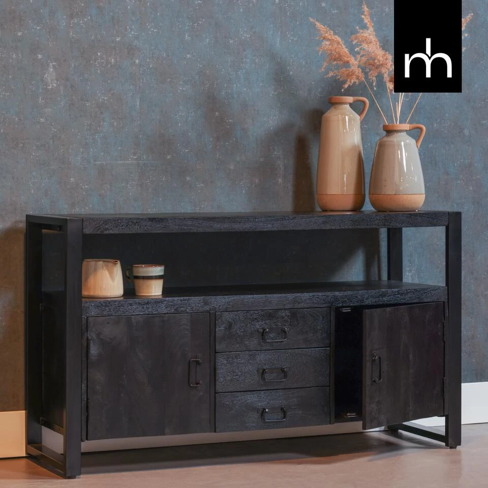 Het massieve mangohout is eerst gezandstraald, vervolgens behandeld met zwarte verfbeits en tenslotte afgewerkt met een donkere, natuurlijke bijenwas om het hout te beschermen tegen vocht, vuil en kringen. De metalen frames en handgrepen zijn behandeld met een zwarte poedercoating.