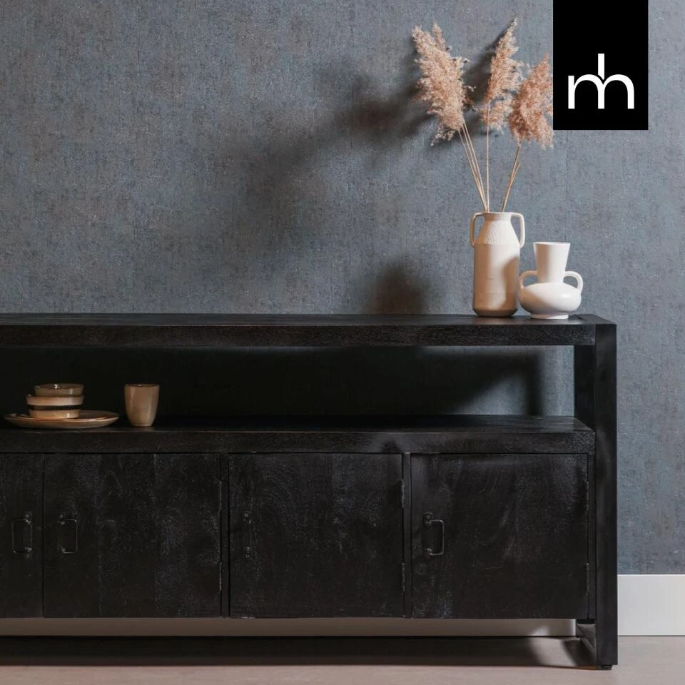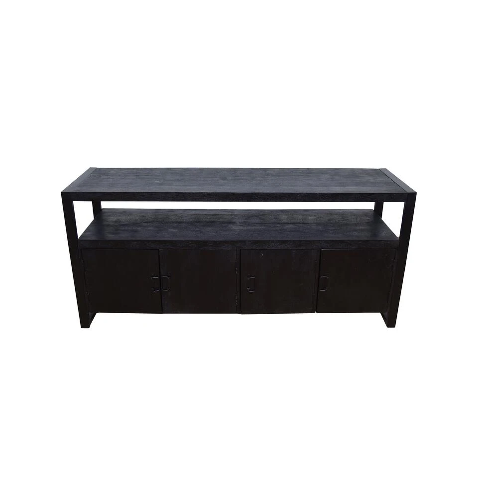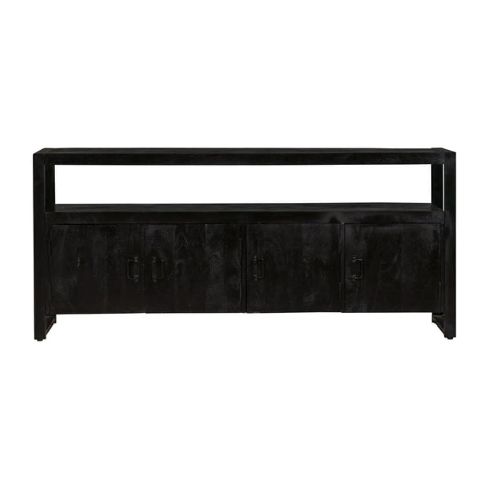 Haal een stoer en robuust meubel in huis met dressoir Pittsburgh. De kast van zwart mangohout biedt achter de vier deurtjes voldoende ruimte om van alles op te bergen. De open ruimte kunt onder andere gebruiken voor elektronische apparaten of een leuk kussentje ter decoratie. Verder kan het meubel ook uitstekend gebruikt worden als TV meubel.