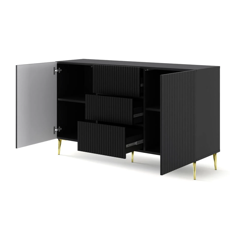 Meubels uit de gepresenteerde Ravenna-collectie worden gekenmerkt door elegantie en unieke uitstraling. Ze zullen geschikt zijn voor moderne arrangementen, het interieur van de woonkamer of eetkamer veranderen. De eenvoud van de vormen harmonieert perfect met de gefreesde fronten. Metalen poten in de vorm van pinnen die het lichaam ondersteunen, benadrukken de stijlvolle uitstraling en zorgen voor stabiliteit, en greeploze fronten voegen een modern design toe.