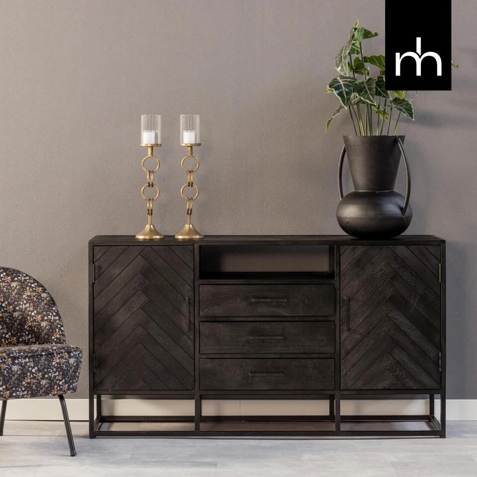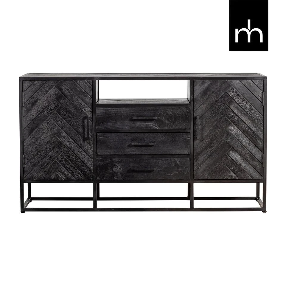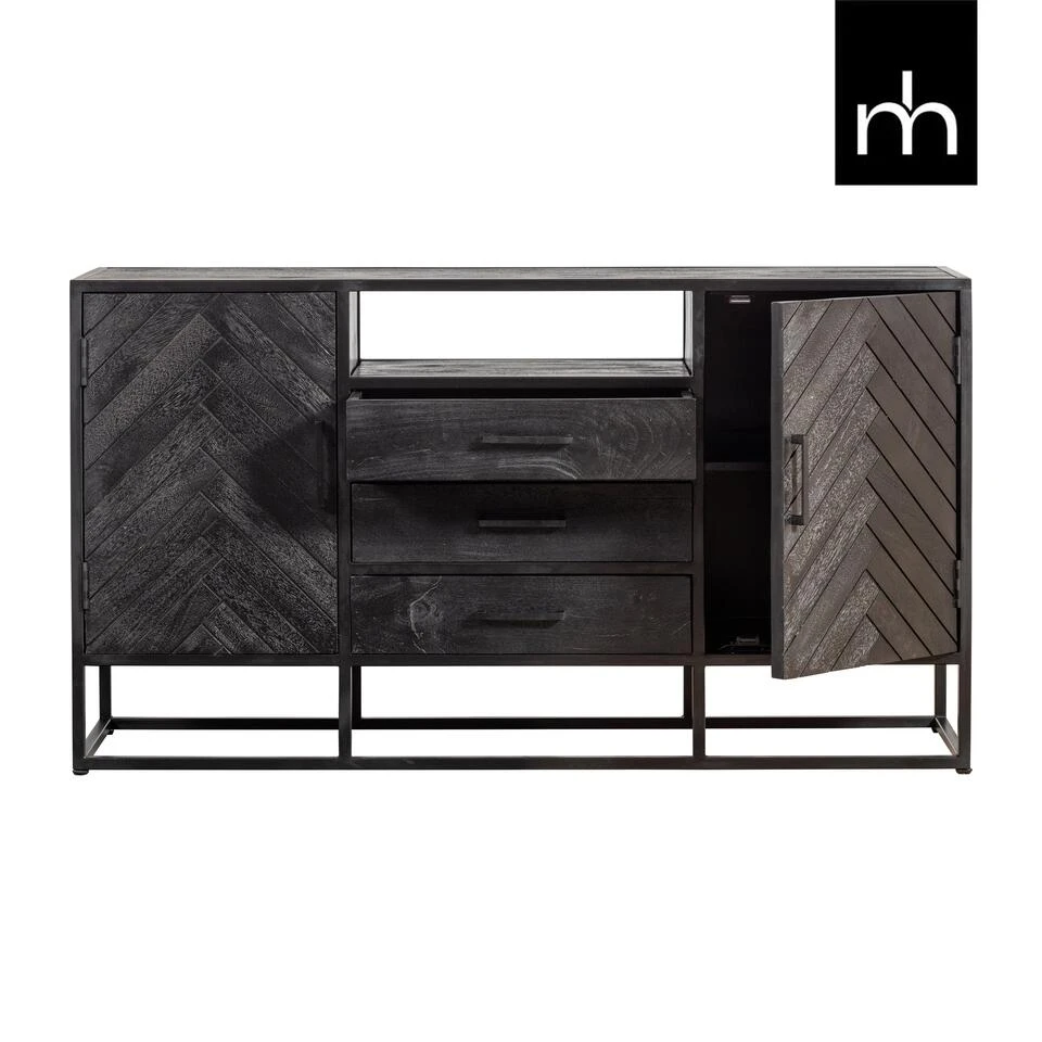 Het massieve mangohout is eerst gezandstraald, daarna behandeld met zwarte verfbeits en tenslotte afgewerkt met een donkere natuurlijke bijenwas, zodat het hout beschermt is tegen vocht, vuil en kringen. Het frame en de handgrepen zijn gemaakt van zwart staal dat is afgewerkt met een zwarte poedercoating.