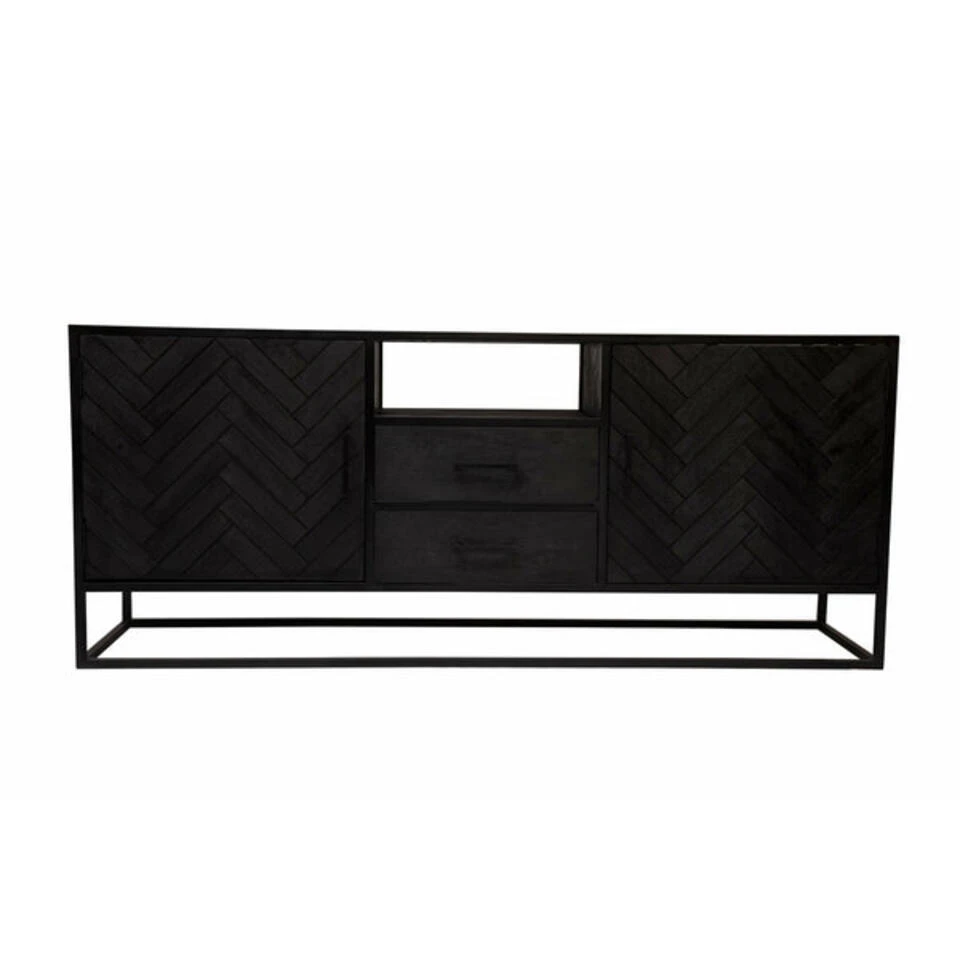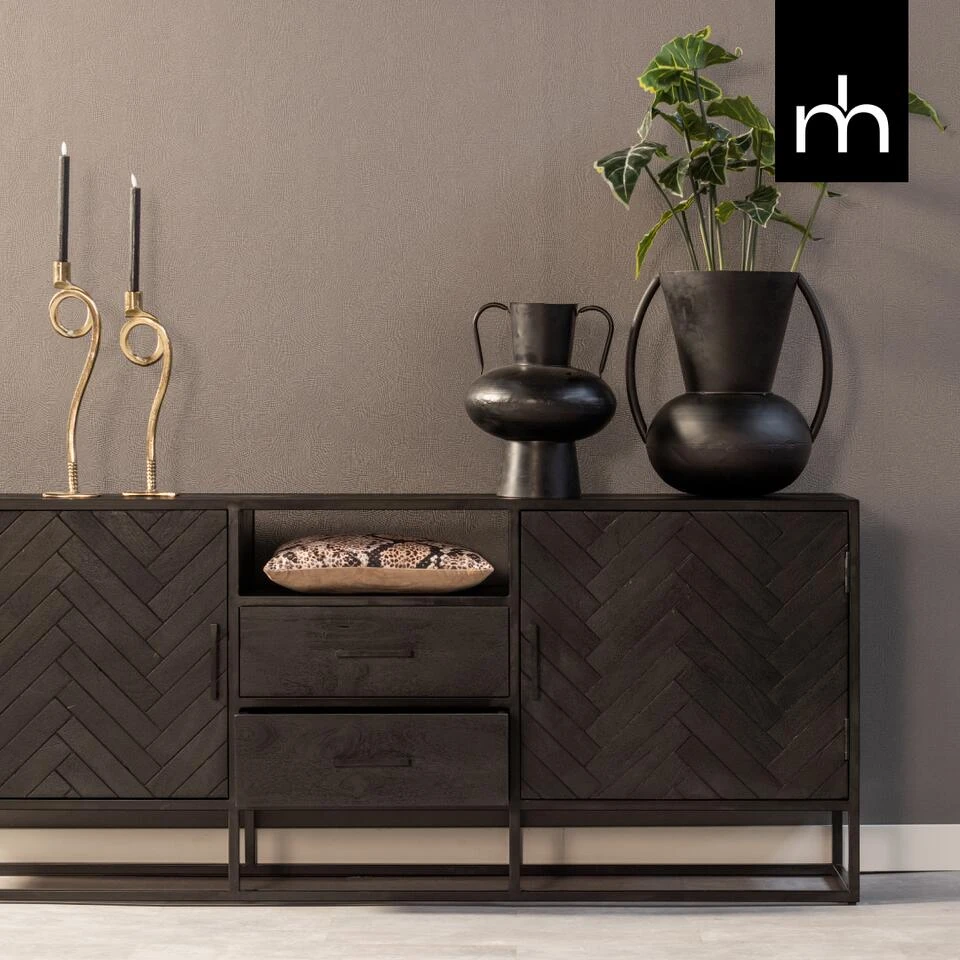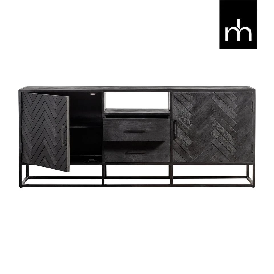 Dit zwarte dressoir uit de Toronto-serie barst van de mogelijkheden. Door het stijlvolle visgraatmotief heeft het meubel een elegante uitstraling. De open onderkant creëert daarnaast een ruimtelijk gevoel. Het meubel beschikt door de twee lades en de ruimtes achter de deurtjes over veel opbergmogelijkheden.
