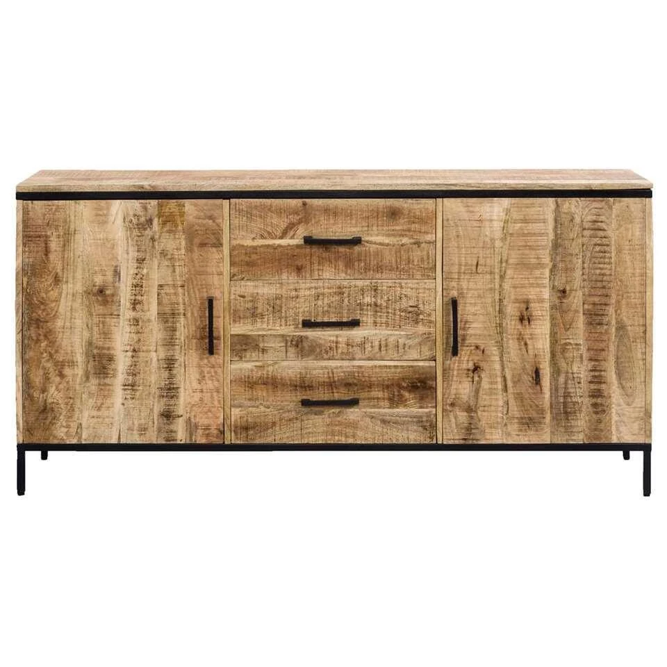 Dressoir Trevor is een stoer dressoir gemaakt van mangohout en metaal. Deze kast beschikt over drie lades en twee deuren. In dit handige en veelzijdige dressoir heb je veel opbergruimte voor bijvoorbeeld serviesgoed en bestek. Zet er leuke accessoires zoals fotolijstjes op en het geheel is compleet. Het dressoir staat stevig op zwart gekleurde metalen poten.