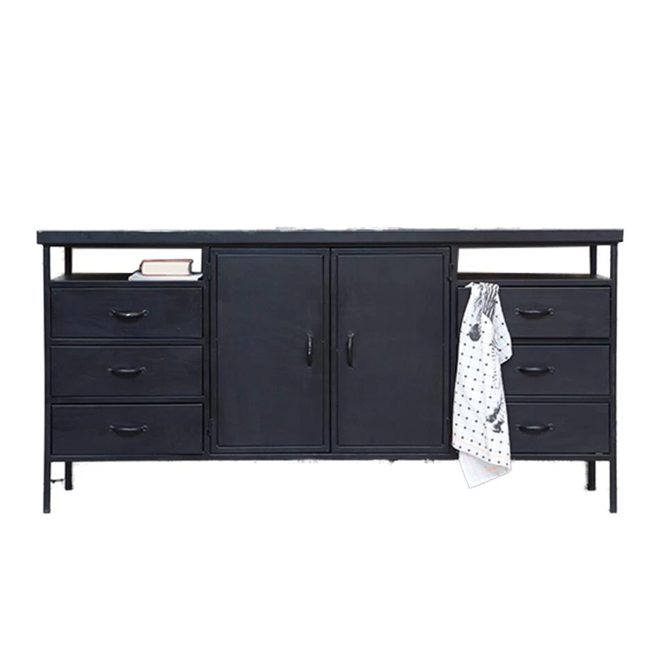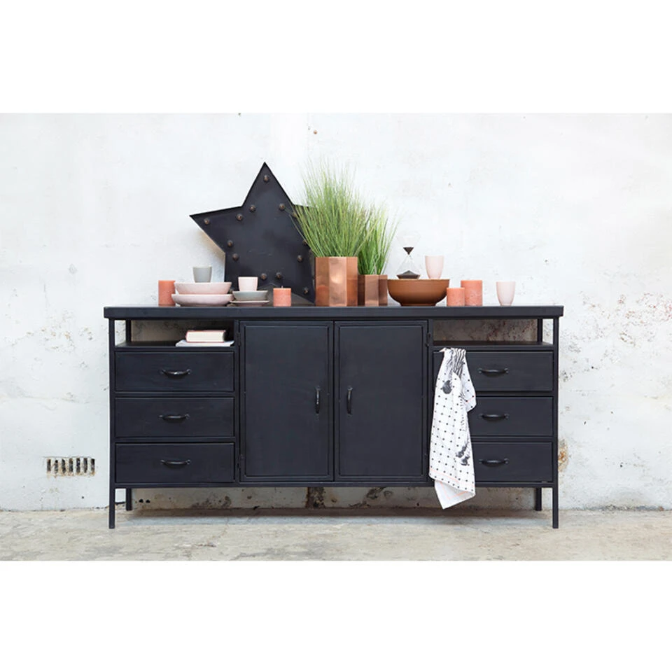 Dressoir Dansk is gemaakt van zwart gespoten metaal. Wat hem een industrieel en stoer uiterlijk geeft. Het dressoir heeft 6 lades met daarboven een open ruimte en 2 deurtjes met opbergruimte. Genoeg ruimte dus om al jouw kostbare spullen in op te bergen. Boven op het dressoir kan je jouw mooiste accessoires neerzetten.