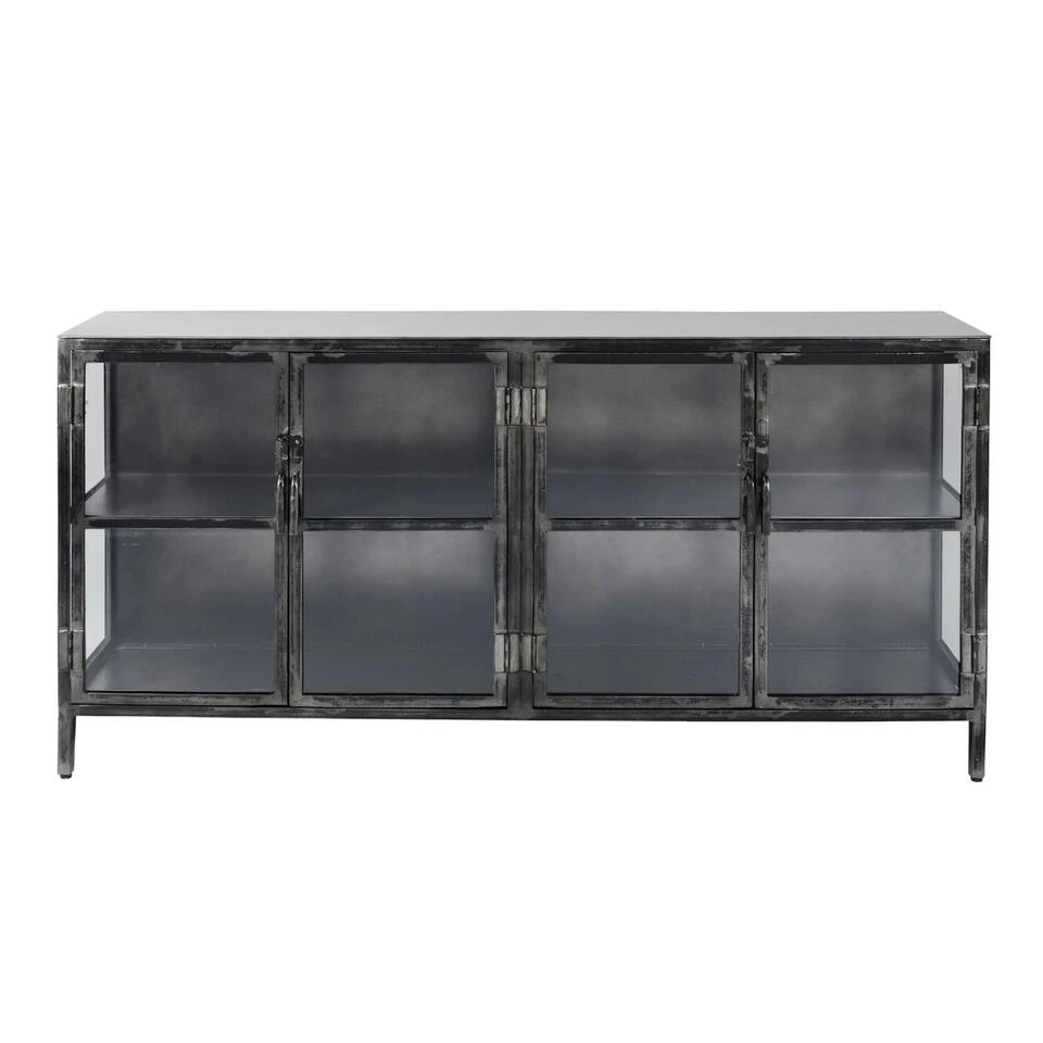 Ontdek dit stoere Evan dressoir met een breedte van 180 cm en welke grotendeels gemaakt is van gun metal. Dit model bevat vier glazen deuren, waarachter zich één schap bevindt. Precies in het midden is dit dressoir gesloten, wat betekent dat hij uit twee delen bestaat. Combineer dit dressoir met de andere meubels uit dezelfde serie voor een complete look!