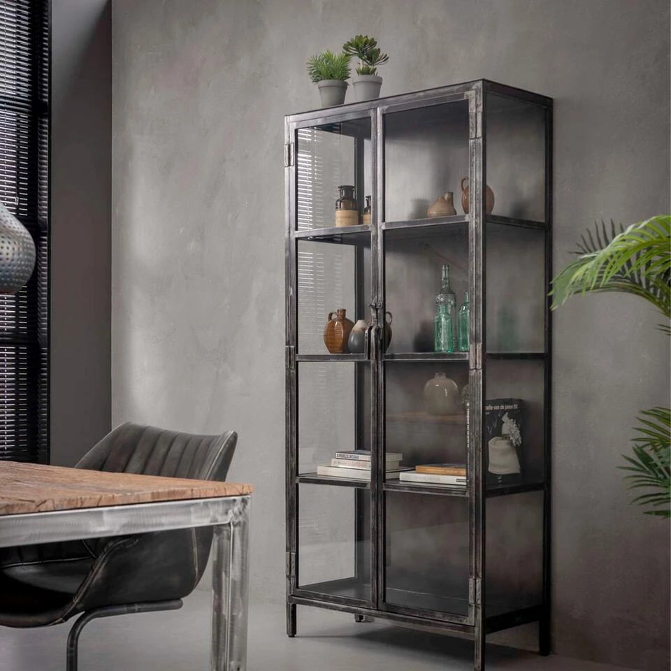 Voeg een moderne en stoere sfeer toe aan uw interiruer met vitrinekast Evan van het woonmerk Fraaai. De vitrinekast past goed in een industrieel intrieur en heeft een stoere uitstraling. Door de combinatie met glas kunt u uw mooiste decoratie hierin tonen. Combineer Evan ook met het dressoir uit dezelfde lijn voor eenheid binnen uw interieur. De vitrinekast is voorzien van 2 glazen deuren en 3 schappen. Vitrinekast Evan Metaal wordt opgebouwd geleverd.