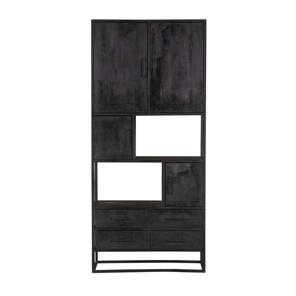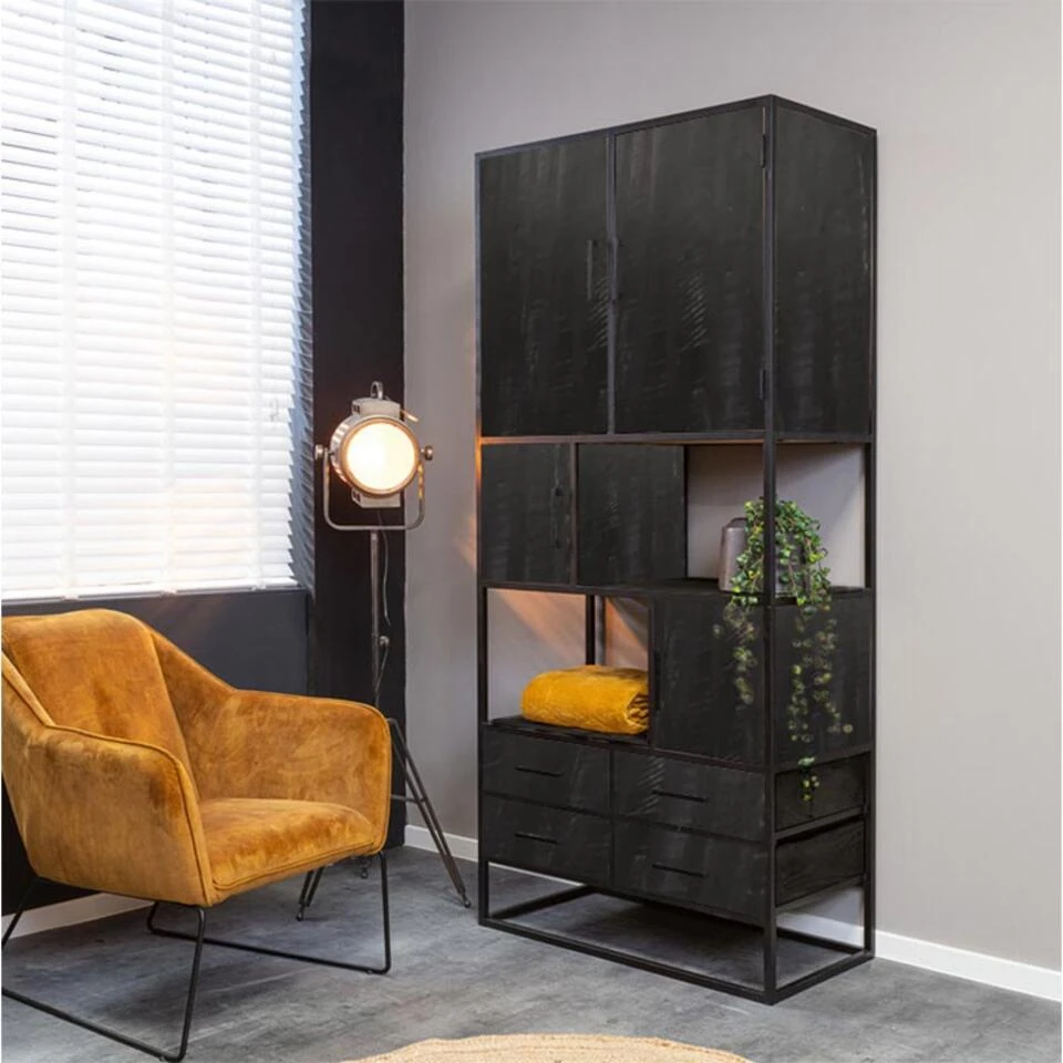 Deze zwarte kast gaat bij kleuren zoals zwart, wit en grijs. Maar aarzel vooral niet om ze te combineren met bijvoorbeeld okergeel, poederroze of petroleumblauw. Het creëert ongeziene contrasten die je interieur een boost geven. Met deze vakkenkast heb je de mogelijkheid om je spullen op te bergen, maar ook om mooie ornamenten tentoon te stellen. Kies jij deze volledig zwarte uitvoering of ga je voor de naturel houten versie?