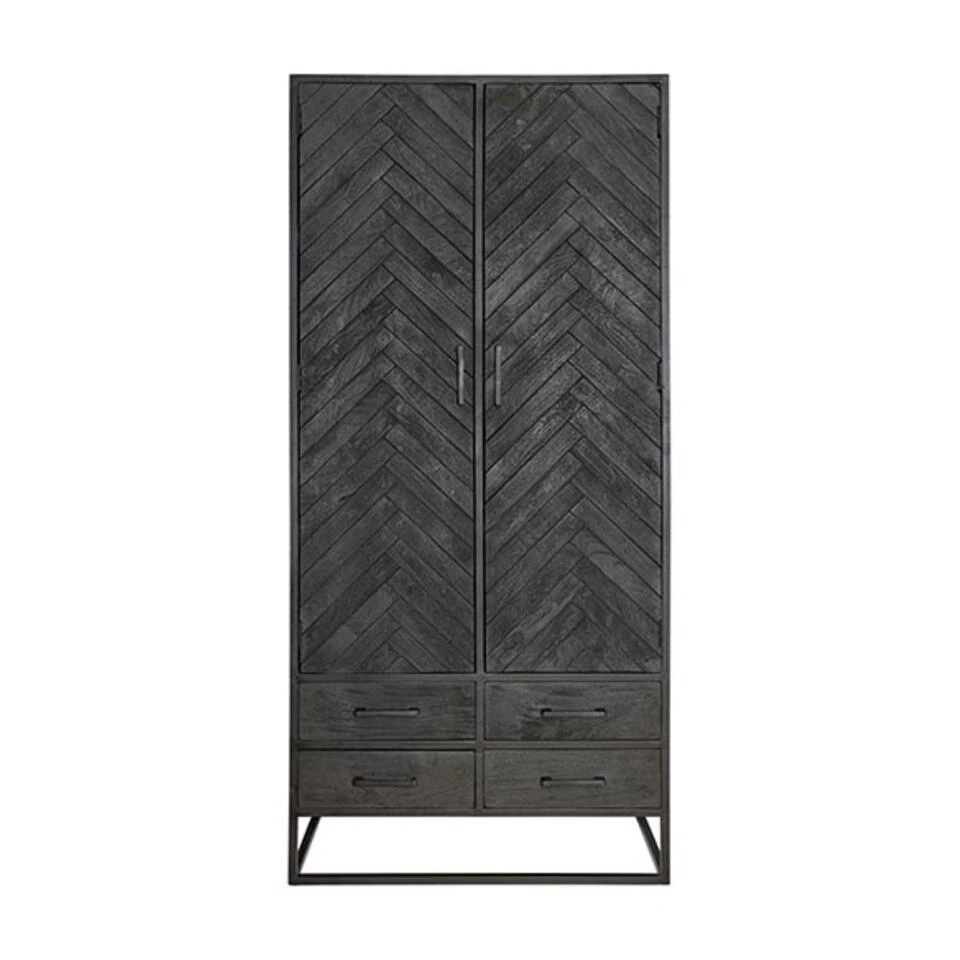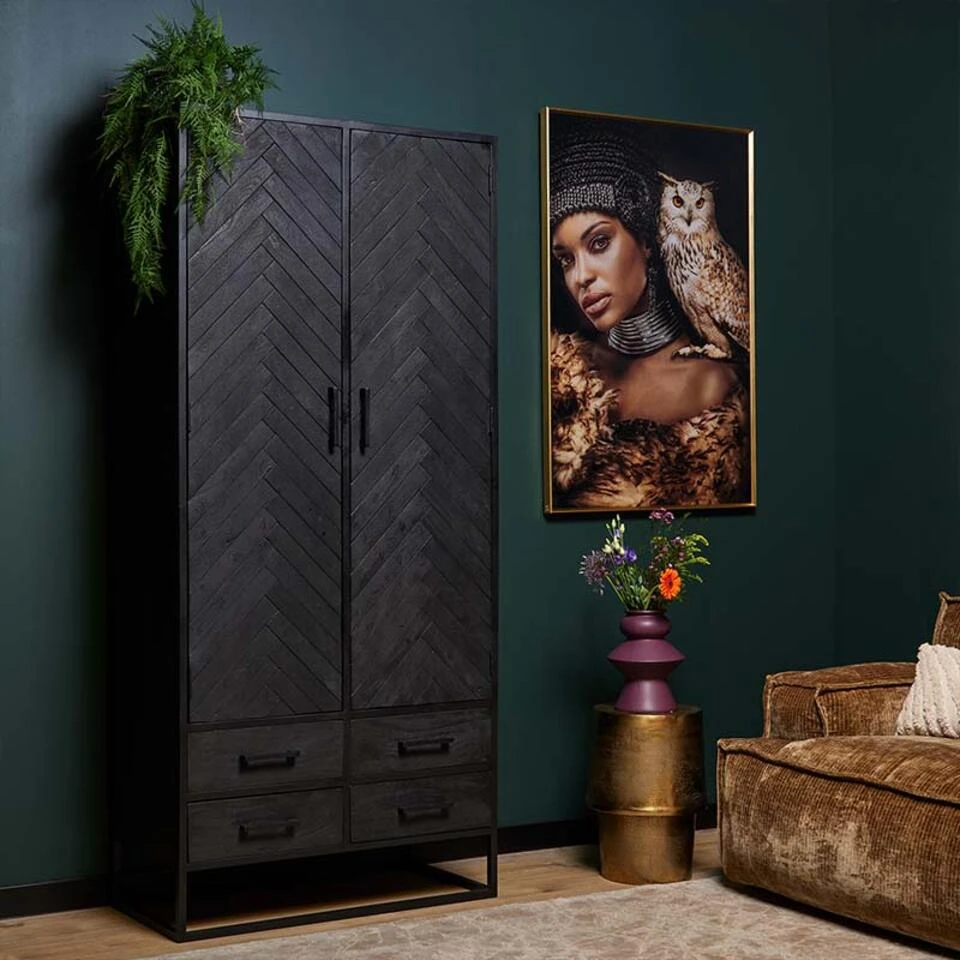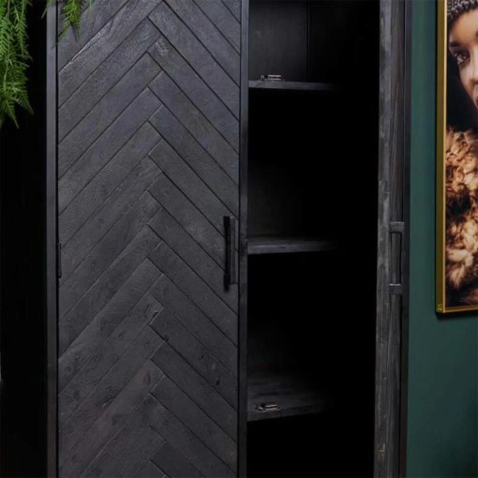 Het visgraatmotief maakt deze kast zeer bijzonder. De zwarte afwerking geeft het een stoere look. Stel je je deze kast voor op je visgraat parketvloer? Of heb je elders in huis geometrische vormen waarmee je deze kast wil combineren? Het is een zeer veelzijdige wandkast die in diverse woonstijlen thuishoort. Modern, vintage of industrieel, deze kast heeft van al deze stijlen wel iets.
