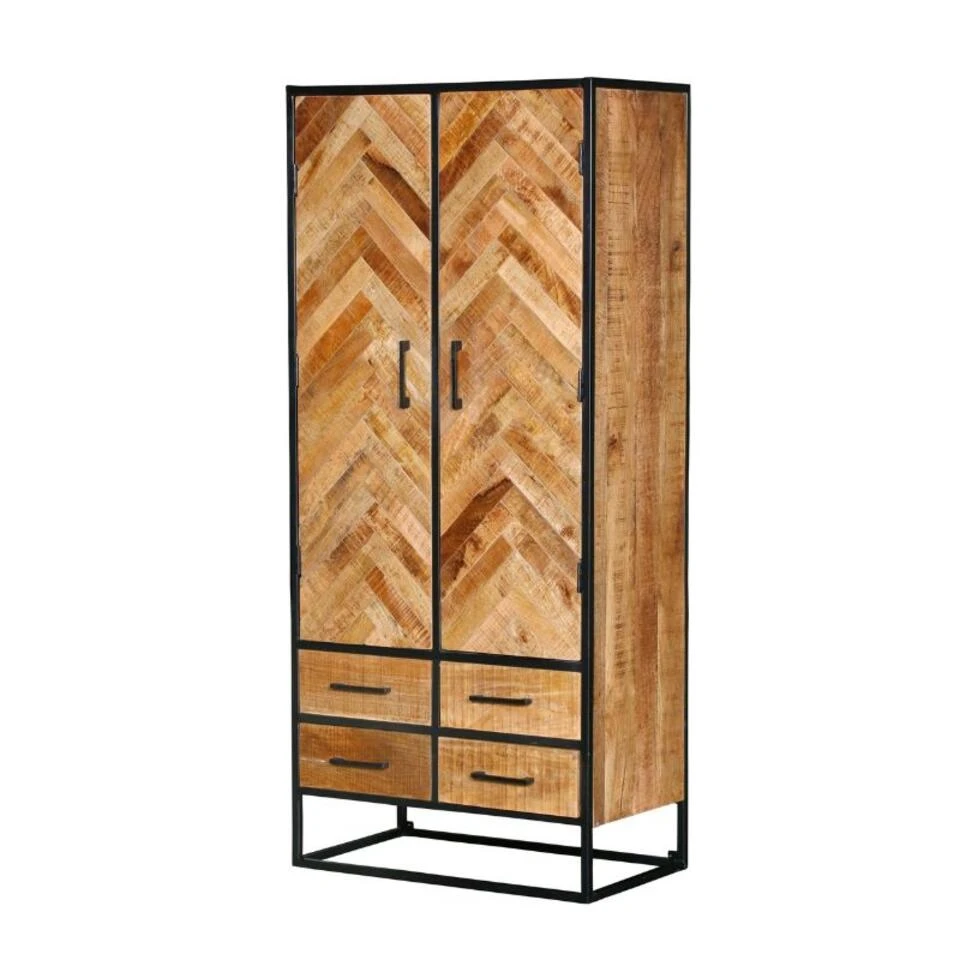 Het visgraatontwerp van deze wandkast Scandi is van hoogstaand niveau. Het is echt vakwerk. Het naturel mangohout wordt nog meer in de verf gezet door het zwarte metalen frame. Het contrast tussen het hout en het metaal is zeer evenwichtig. Deze kast oogt stoer maar is verfijnd afgewerkt. Ze past in een moderne woning dankzij de strakke vormen. Het stoere metaal past in een industriële omgeving en het hout gaat uitstekend in een landelijke woning.