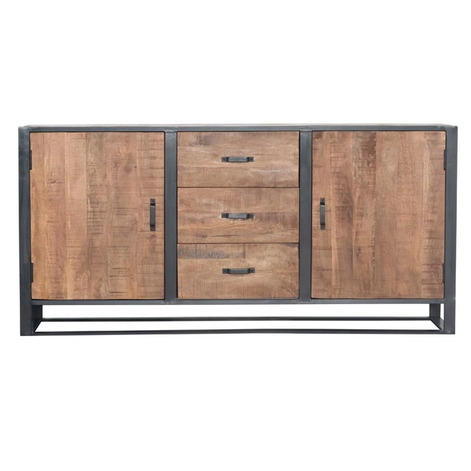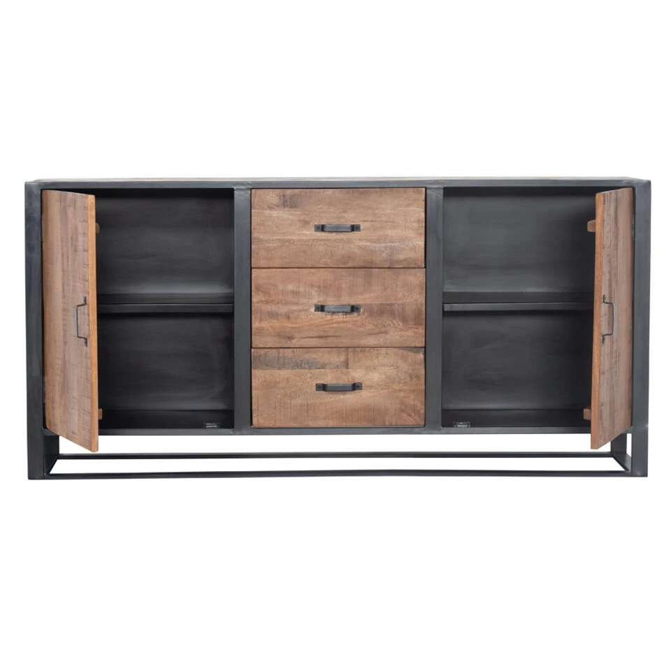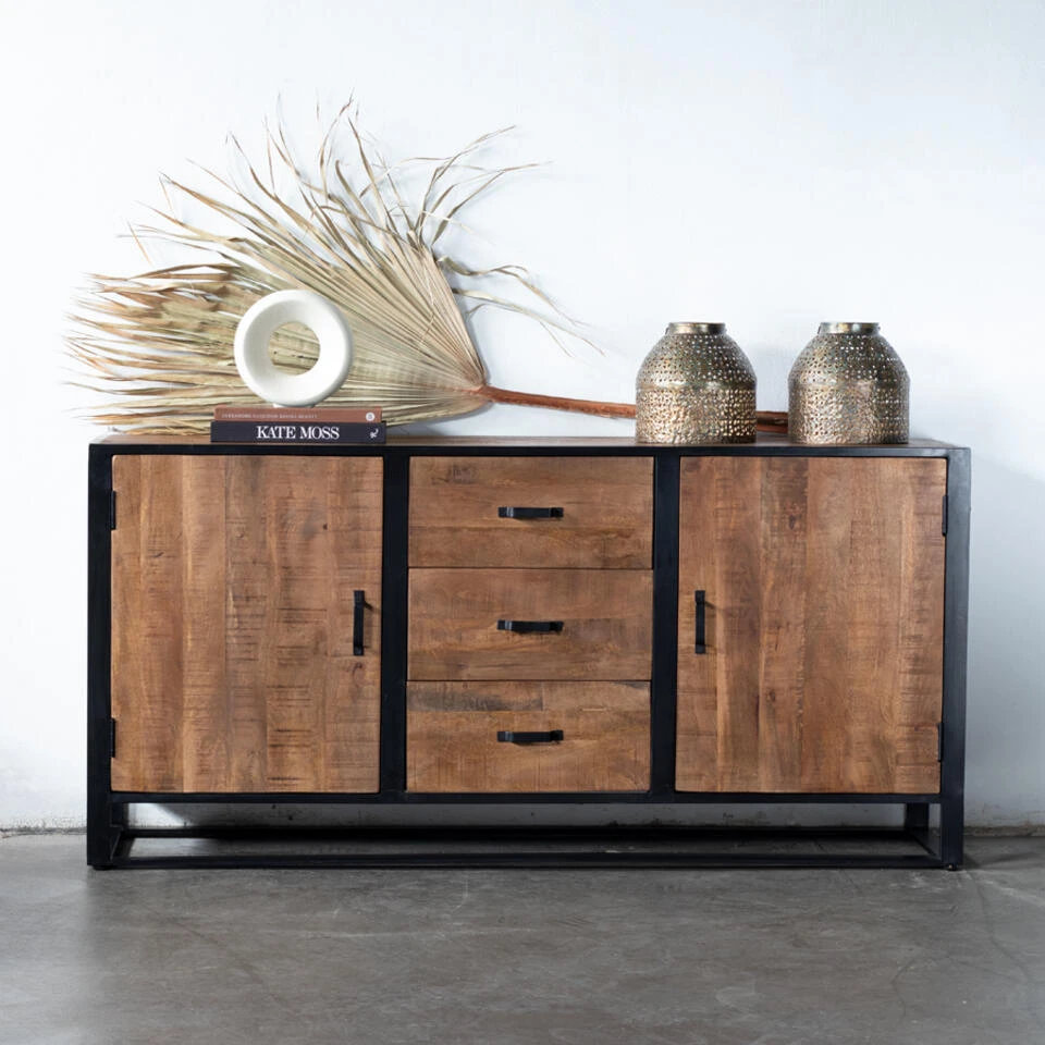 Dressoir Anne heeft een stoer uiterlijk en valt erg makkelijk te combineren binnen veel interieurstijlen. Dressoir Anne heeft 2 deuren en 3 lades waar je je al je spullen in kwijt kan. Het dressoir is gemaakt van mangohout met een zwart metalen frame. Dit dressoir is 180cm breed, 45cm diep en 90cm hoog. De hoogte tussen de planken is 34cm. Zie jij Dressoir Anne al in jouw interieur staan? Bestel deze gemakkelijk bij en profiteer van onze gratis verzending bij een besteding boven de 100,-.